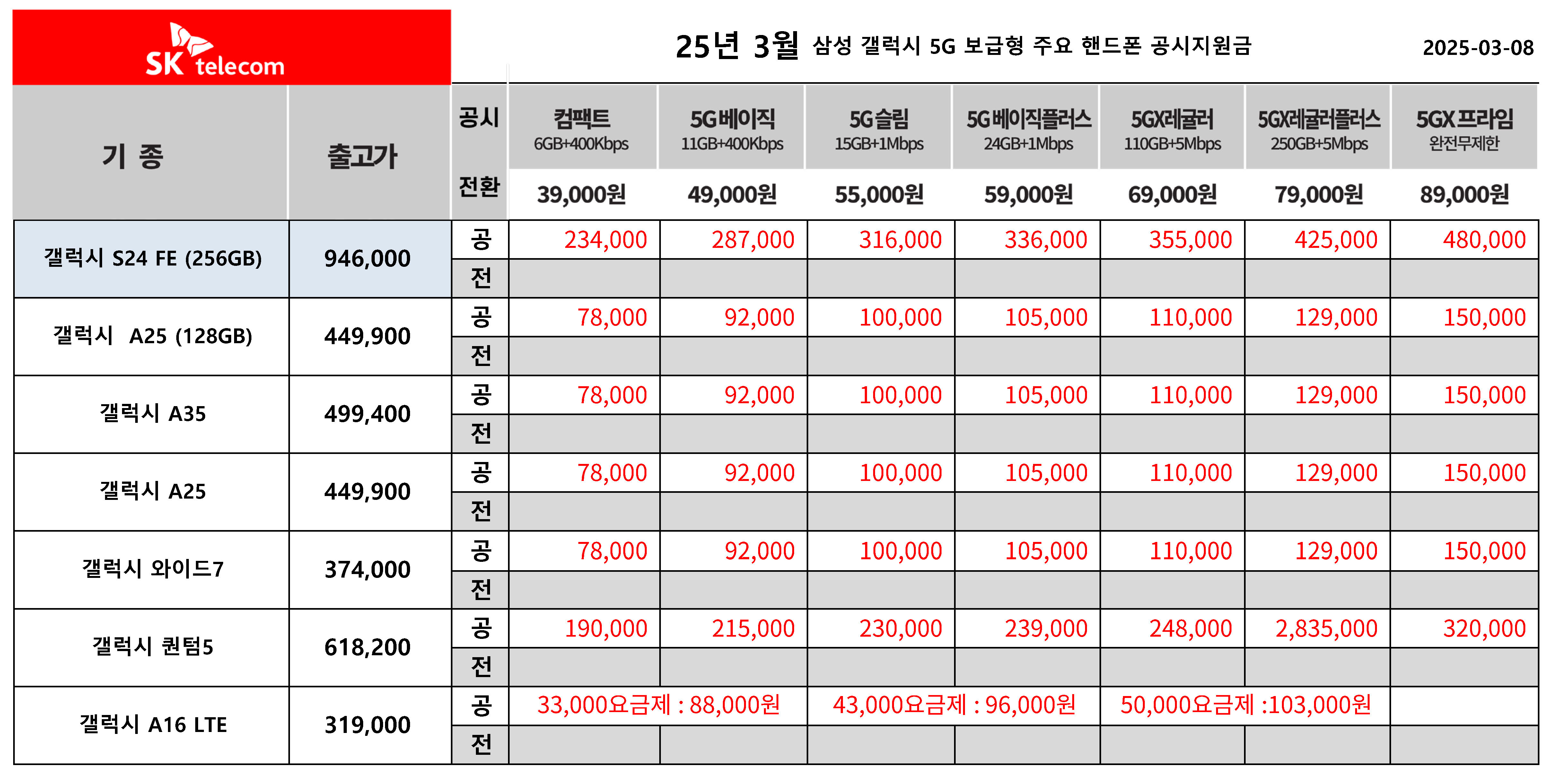 25년 3월 sk텔레콤 주요 핸드폰 공시지원금 정리 포스팅입니다.