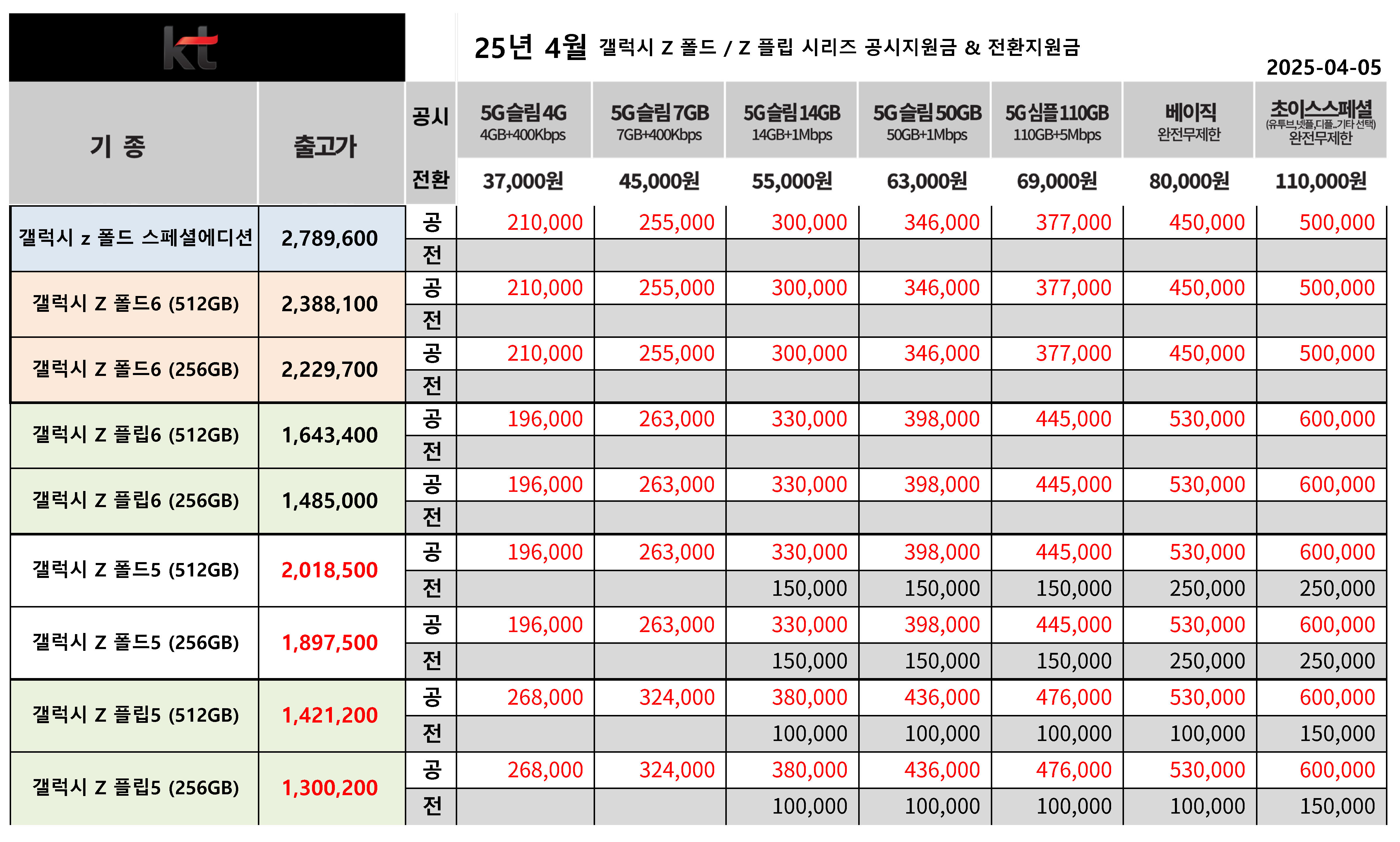 4월 KT 갤럭시 Z 폴드6, 5 시리즈, Z 플립 6, 5 시리즈 공시지원금