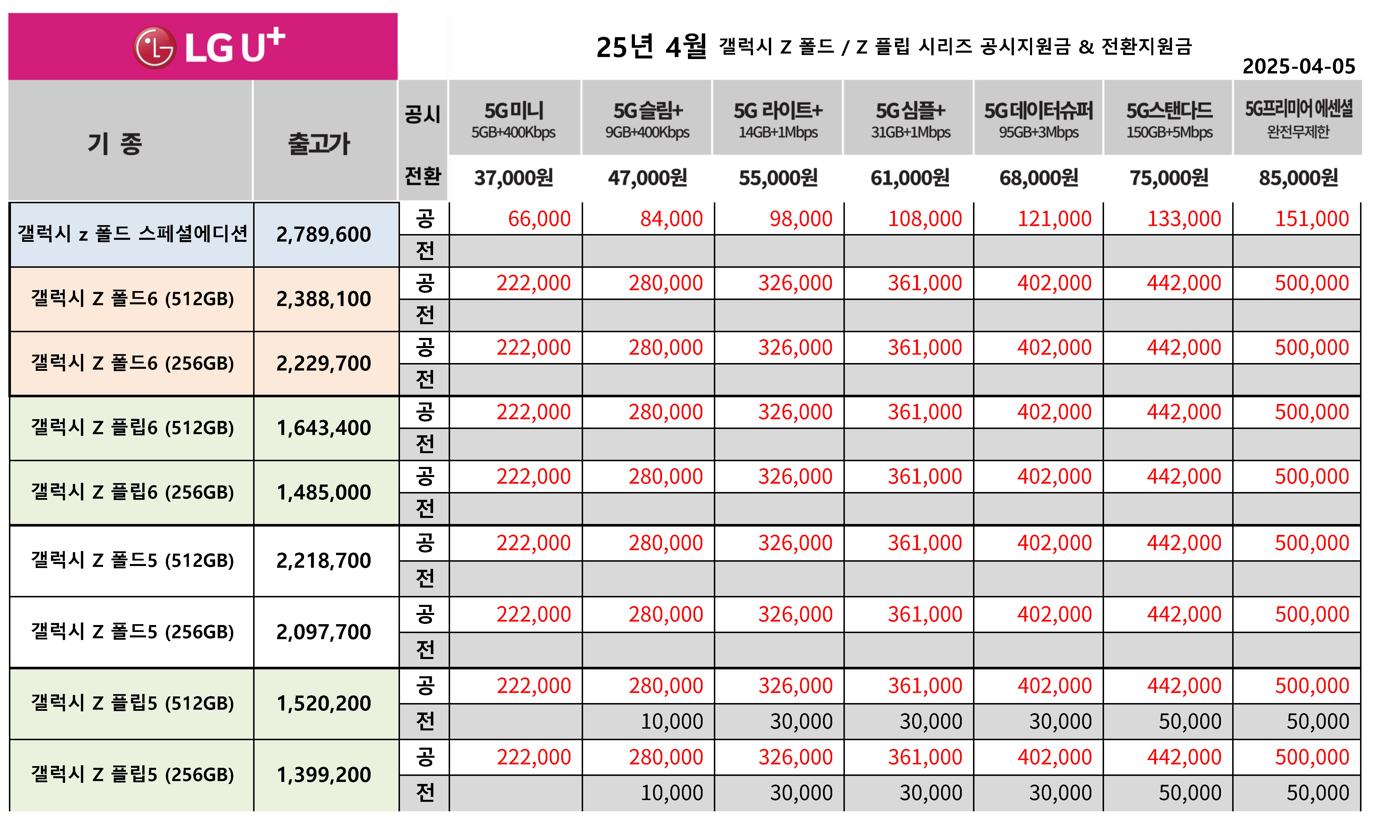25년 4월 LG유플러스 갤럭시 Z 폴드6, 6시리즈 / Z플립 6, 5 시리즈 공시지원금