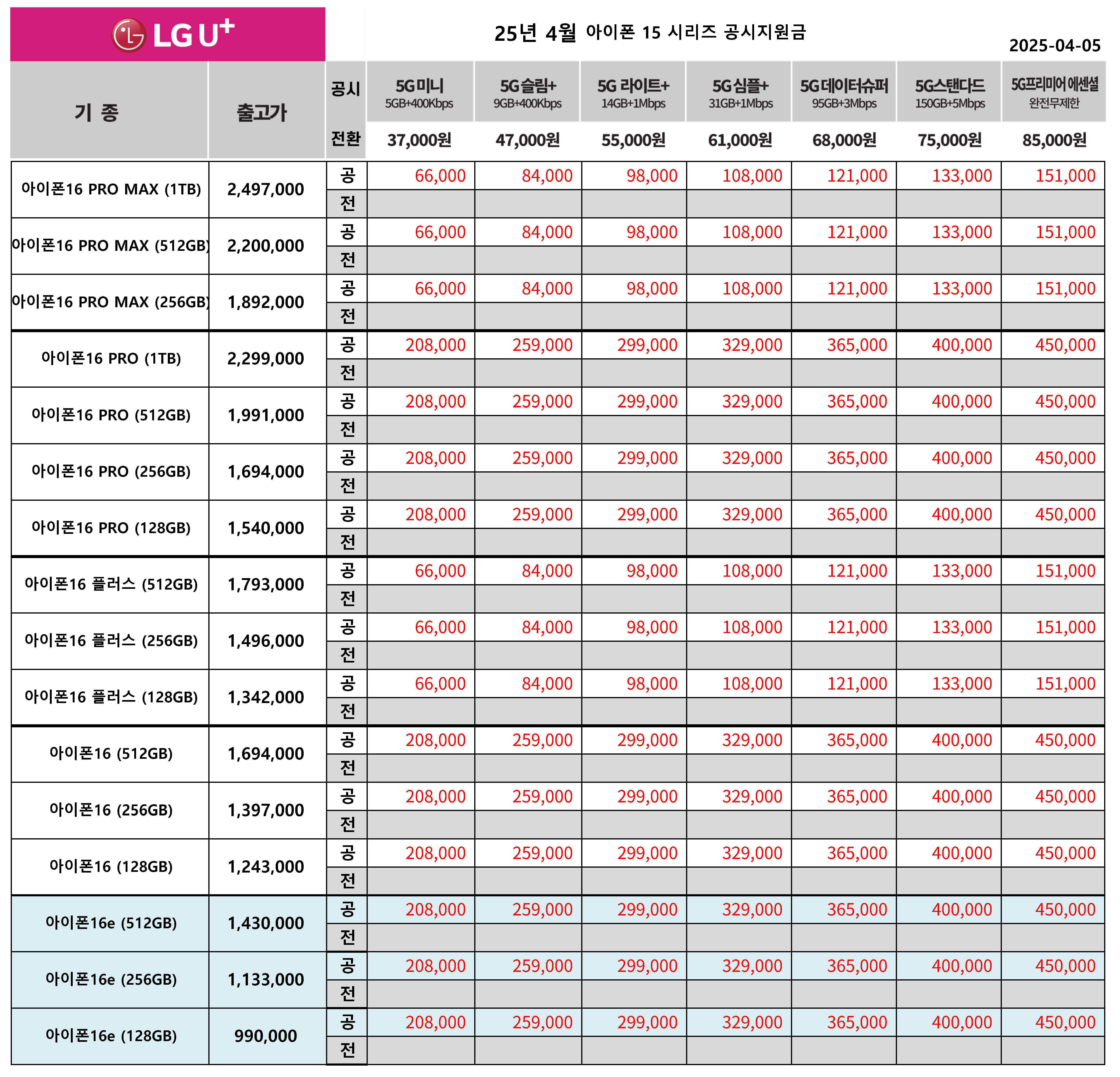 25년 4월 LG유플러스 아이폰 16 시리즈 공시지원금 - 아래 이미지 오타수정 못 해서 죄송해요