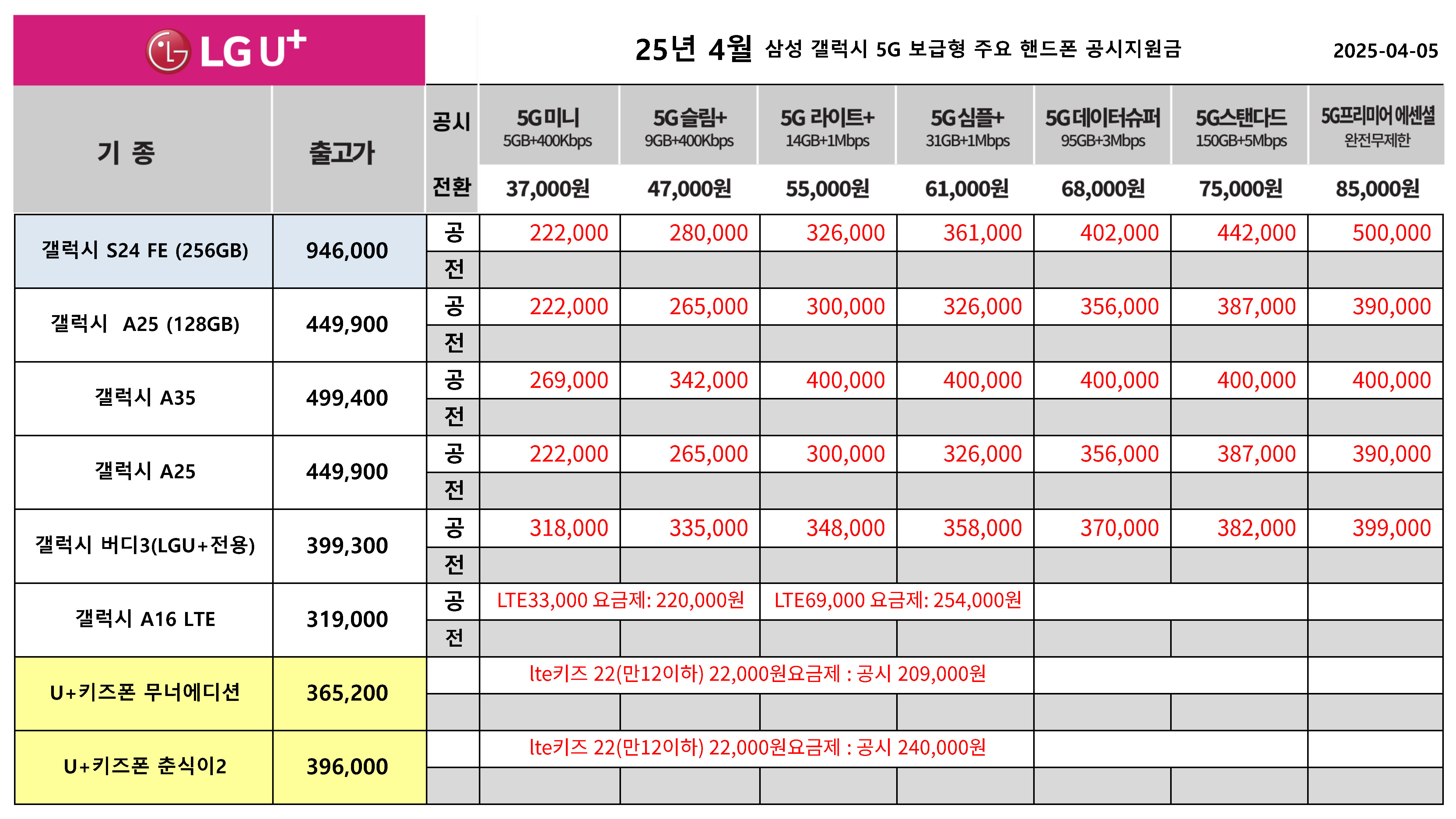 25년 4월 LG유플러스 주요 핸드폰 공시지원금 정리