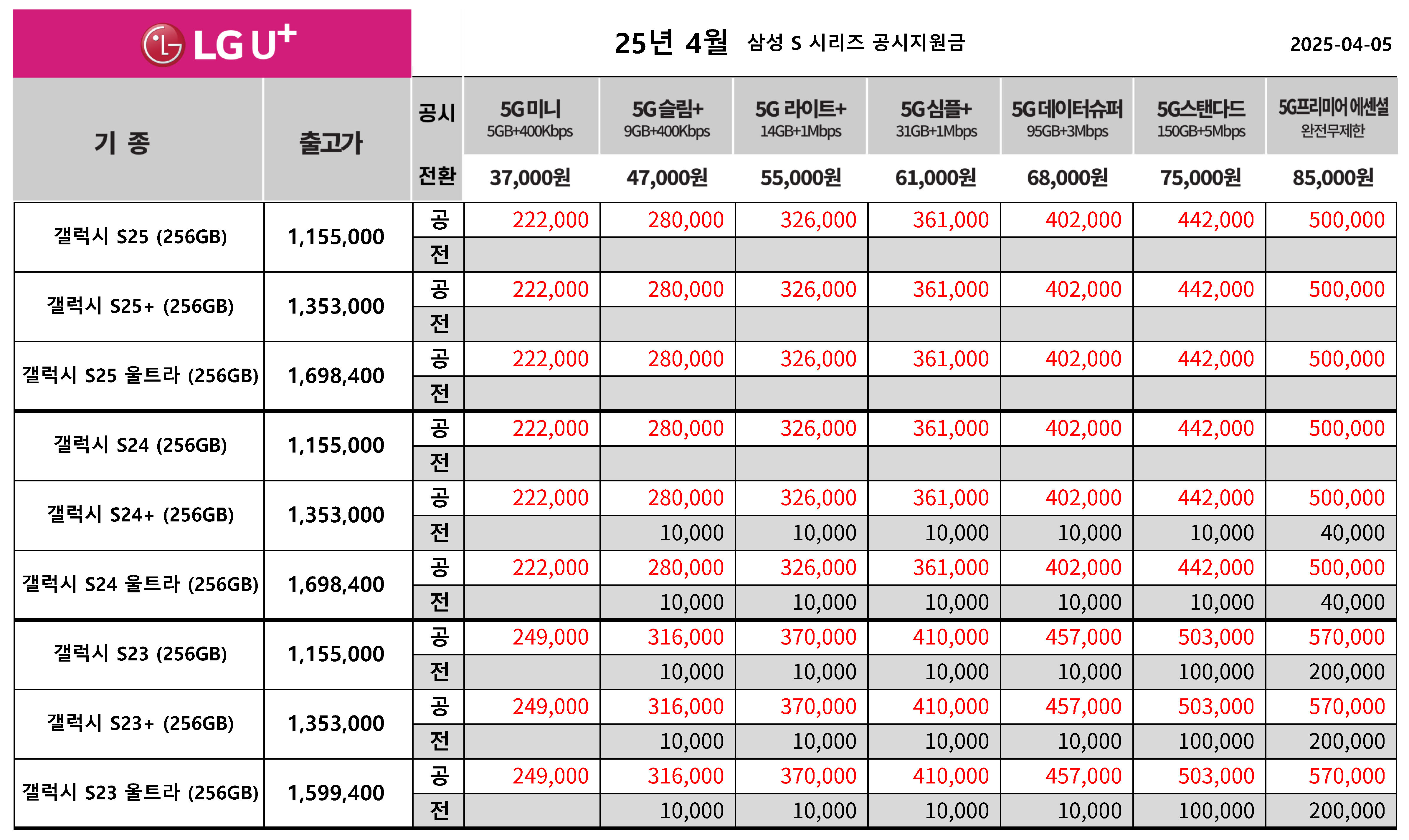 25년 4월 LG유플러스 갤럭시 S25, S24. S23 시리즈 공시지원금