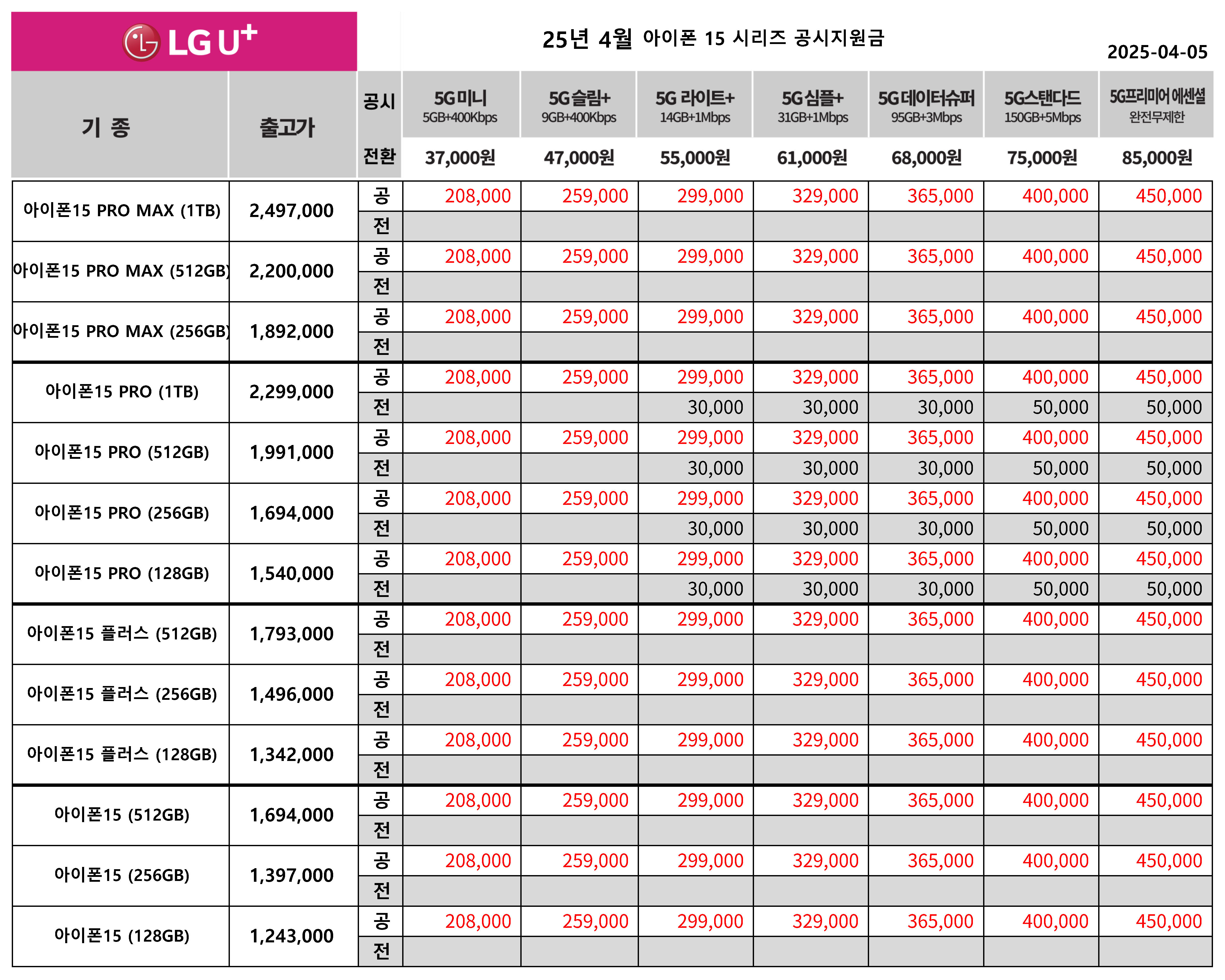 25년 4월 LG유플러스 아이폰 15 시리즈 공시지원금