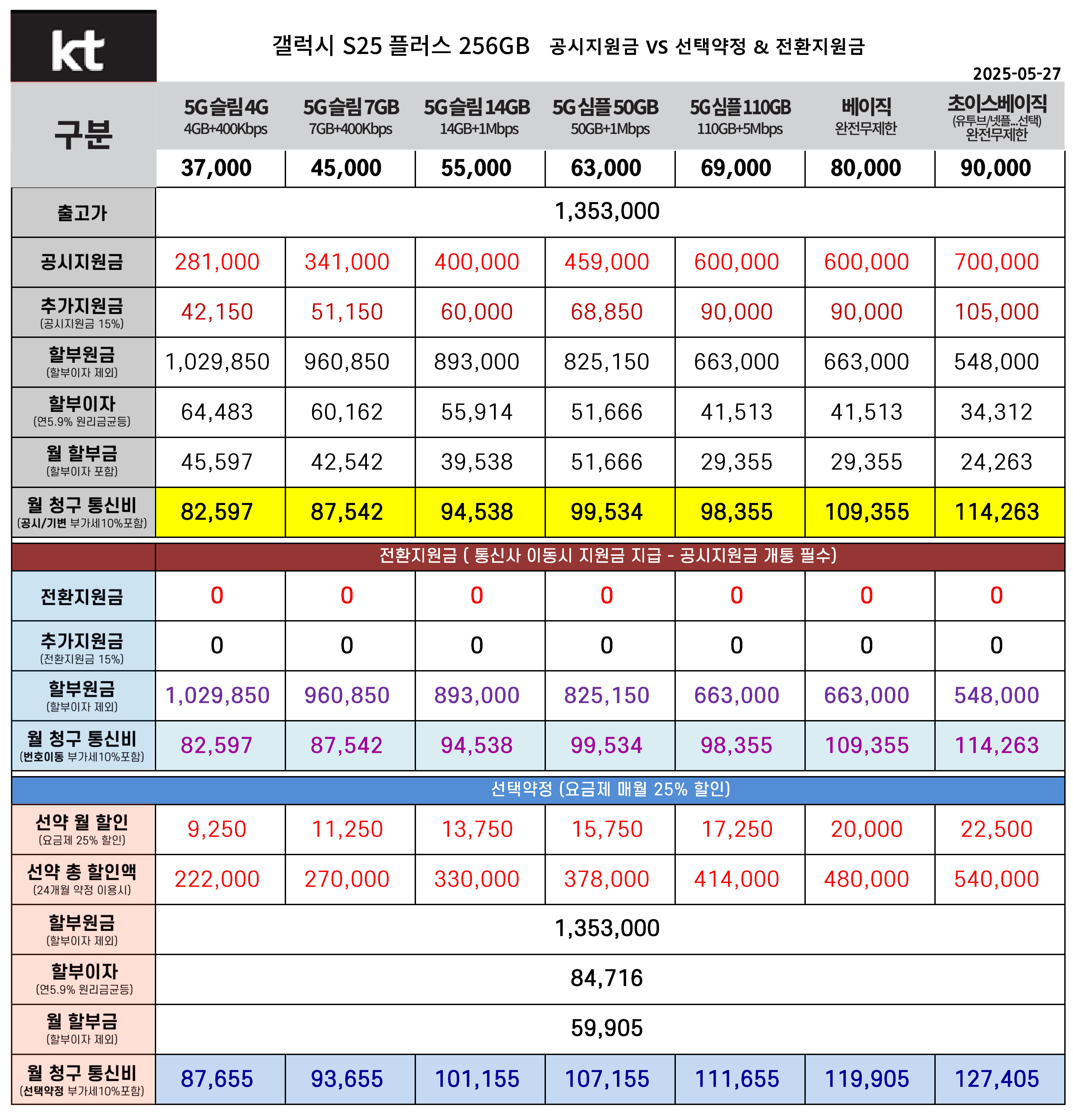 KT 갤럭시 S25 플러스 256GB 공시지원금 & 선택약정 월 통신비 요금표