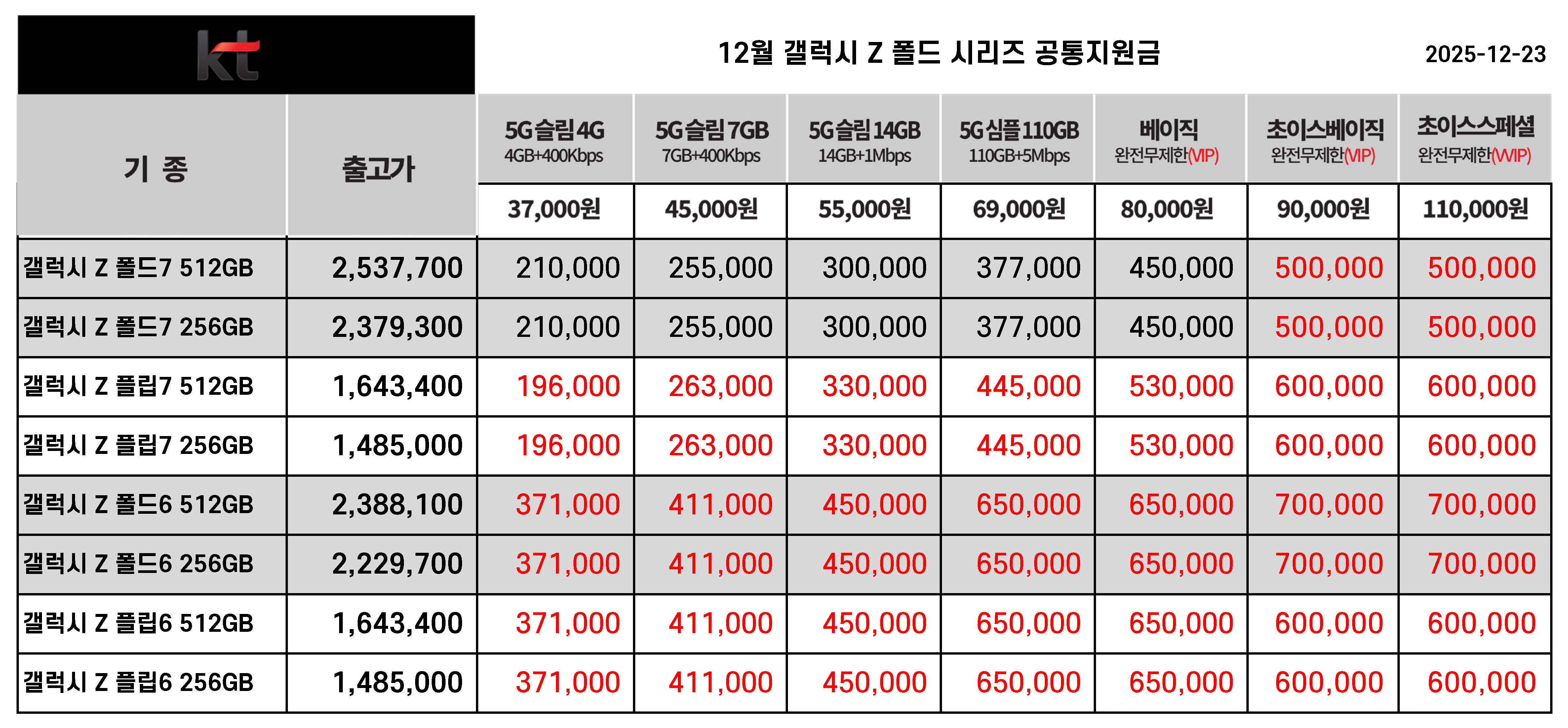 12월 KT 갤럭시 Z폴드 & Z플립 시리즈 공통지원금(공시지원금)