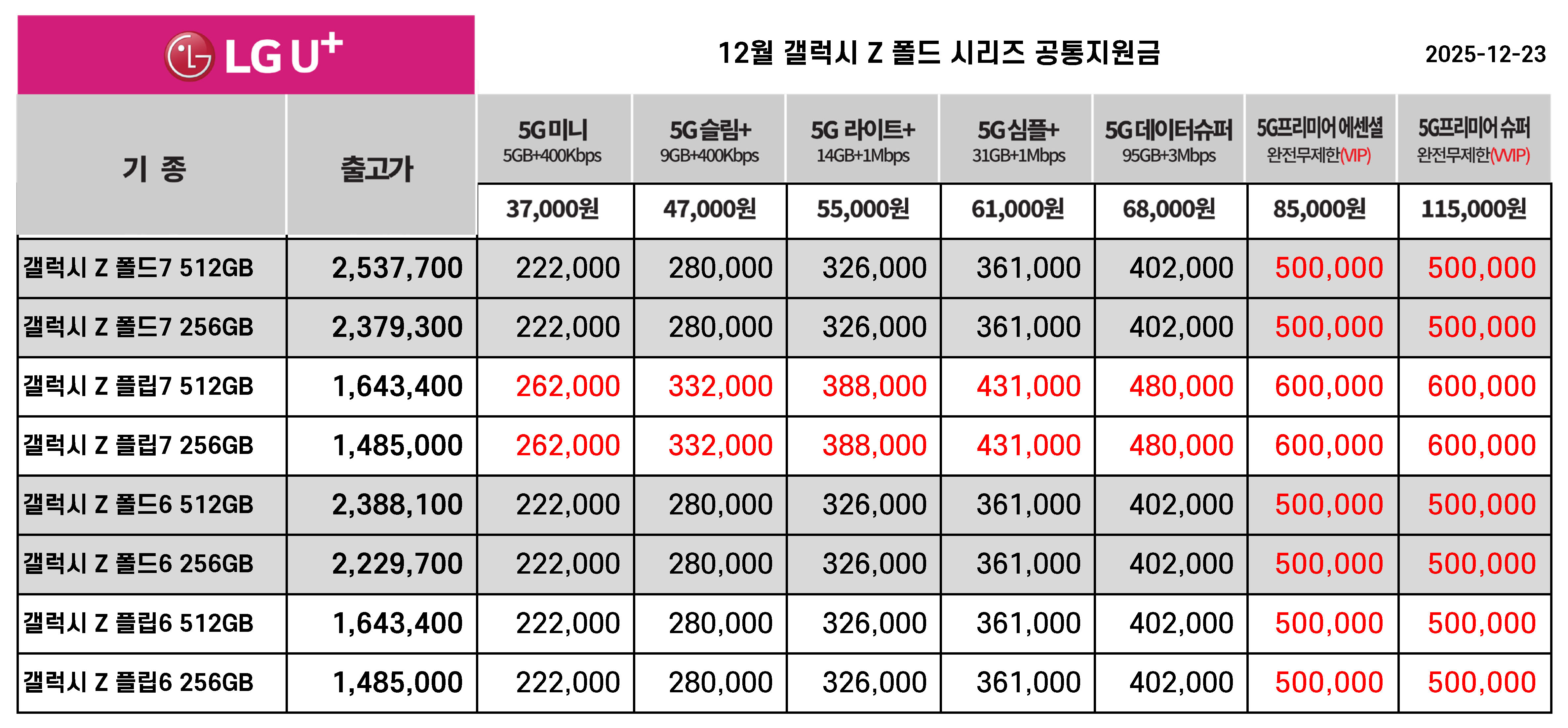 12월 LG유플러스 Z 폴드 & Z플립 시리즈 공통지원금(공시지원금)