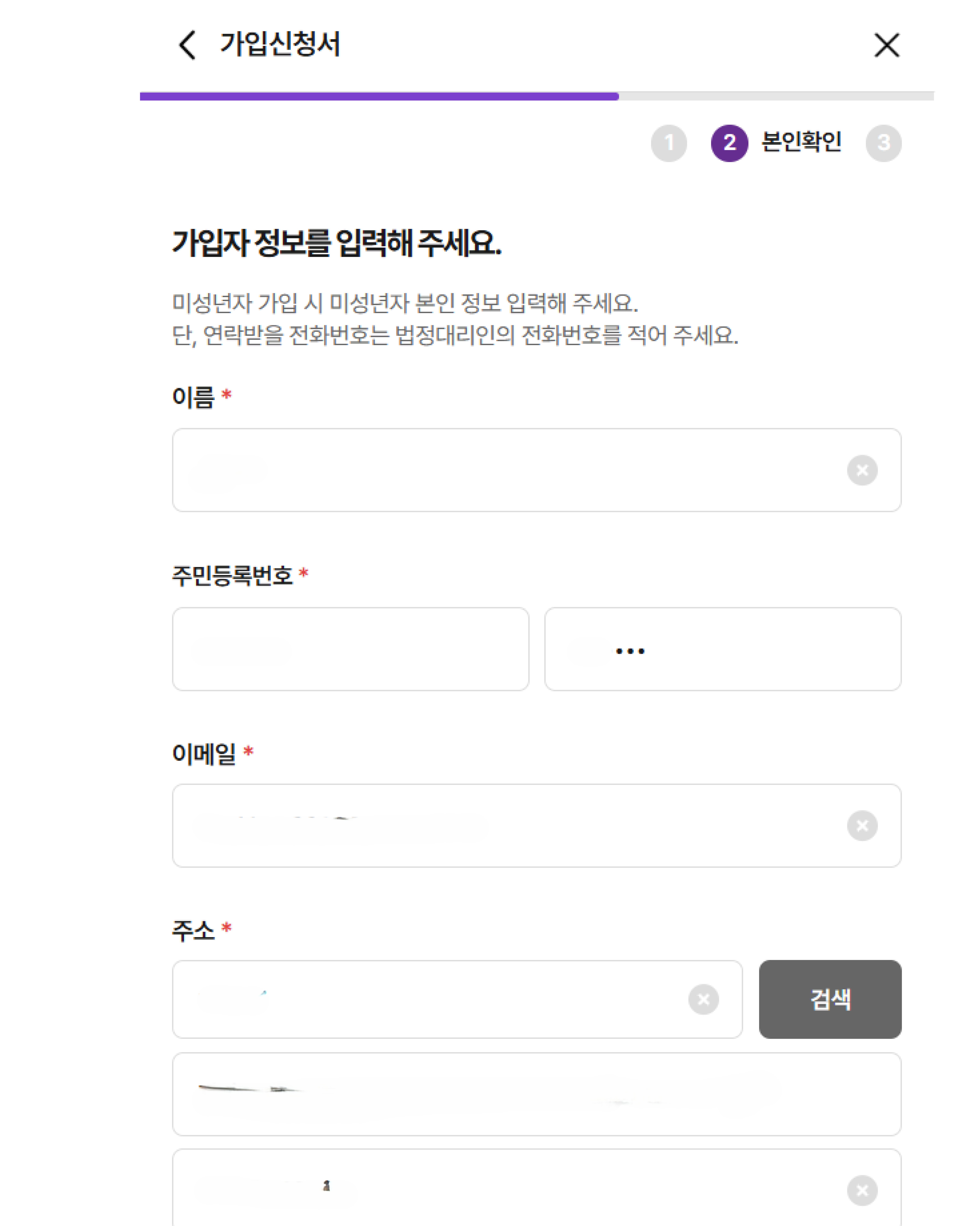 가입자의 이름, 주민번호, 이메일, 주소등의 인적사항을 입력합니다.