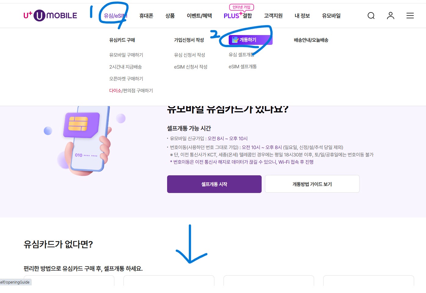 아래로 스크롤하면 셀프개통 가이드를 유투브 영상으로 쉽게 설명도 해 놓았습니다.