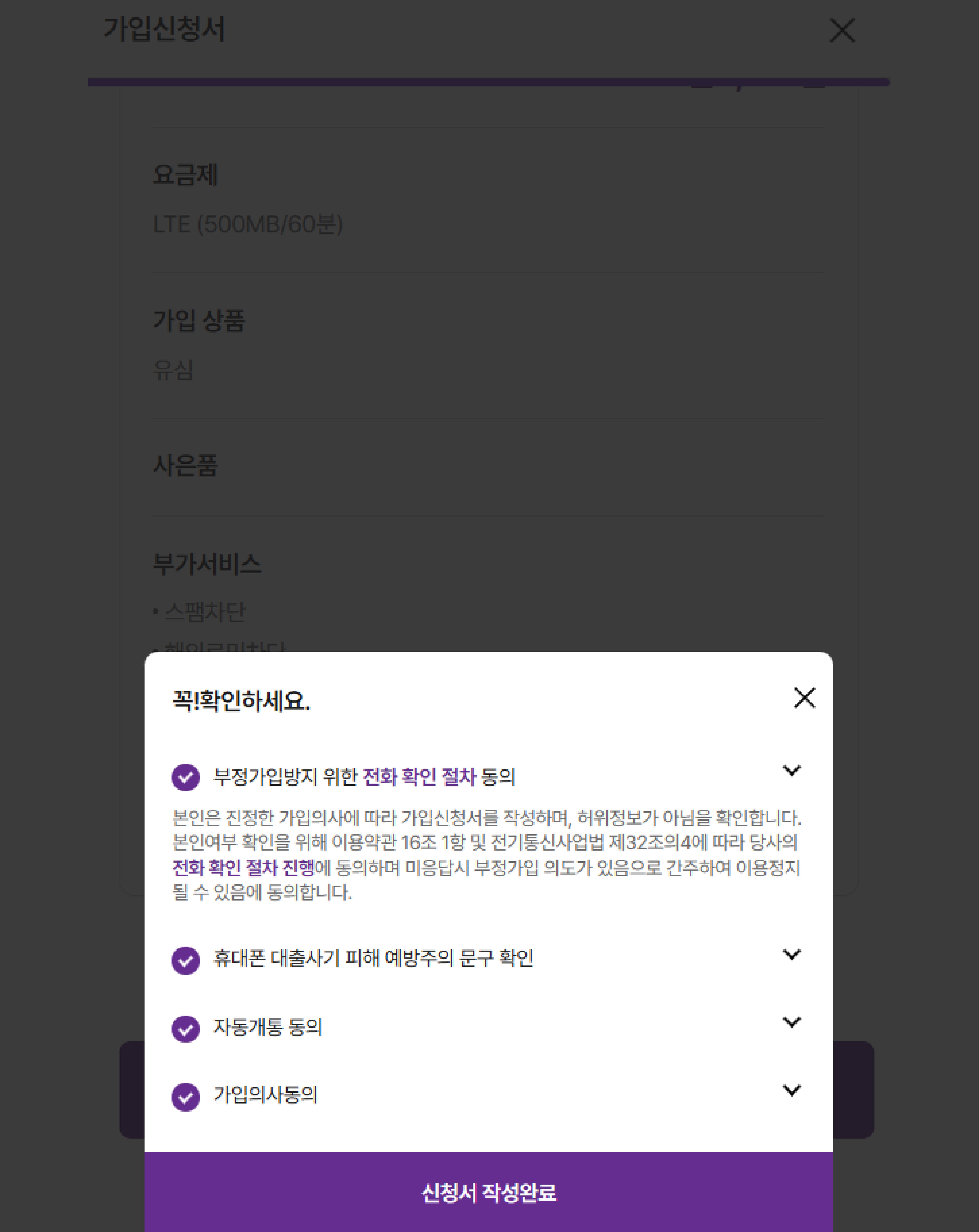 청소년 분과 외국인은 셀프개통이 불가하여 신청서 작성후 상담원 통화가 되어야 하고,