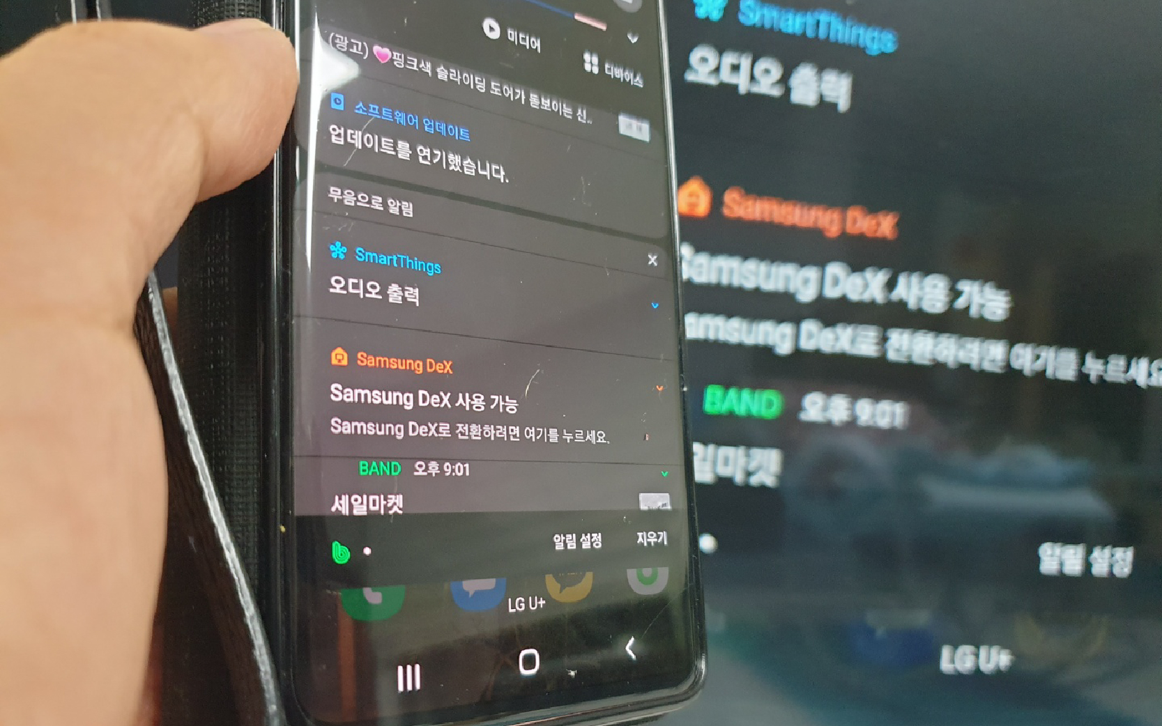 덱스모드의 설정은 갤럭시 휴대폰 디스플레이를 아래로 스크롤 하면 나오는 알림창에서