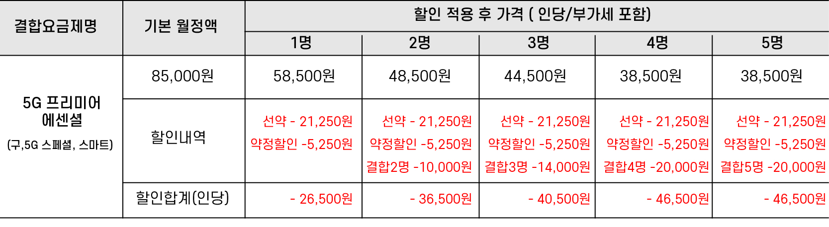 5인: 선택약정 요금제 25% + LTE 요금 그대로 약정할인 5,250원 + 결합할인 20,000원(인당)