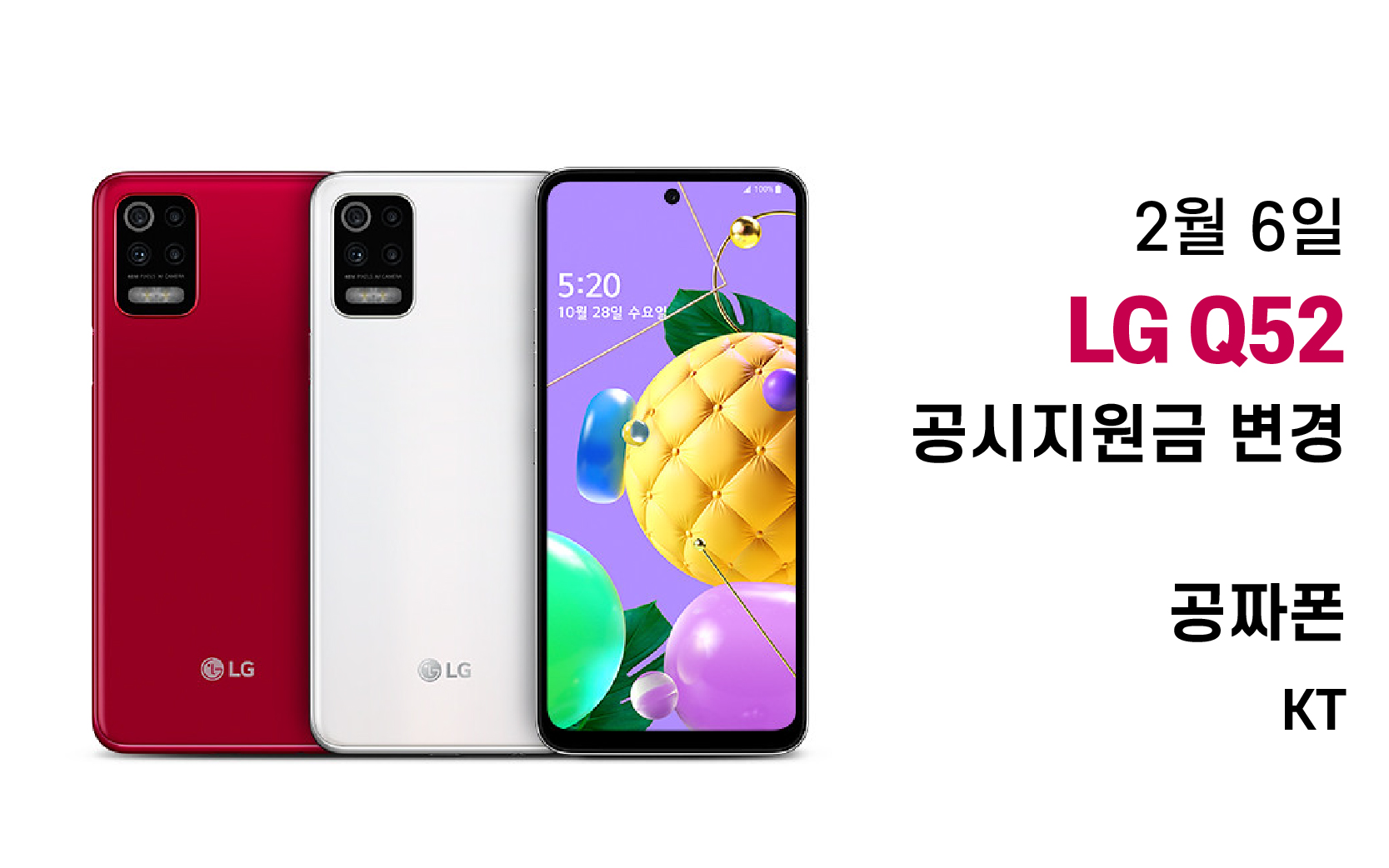 KT LG Q52는 2월 6일 공시지원금이 상향되어 69요금제부터 공짜폰 개통이 가능합니다.