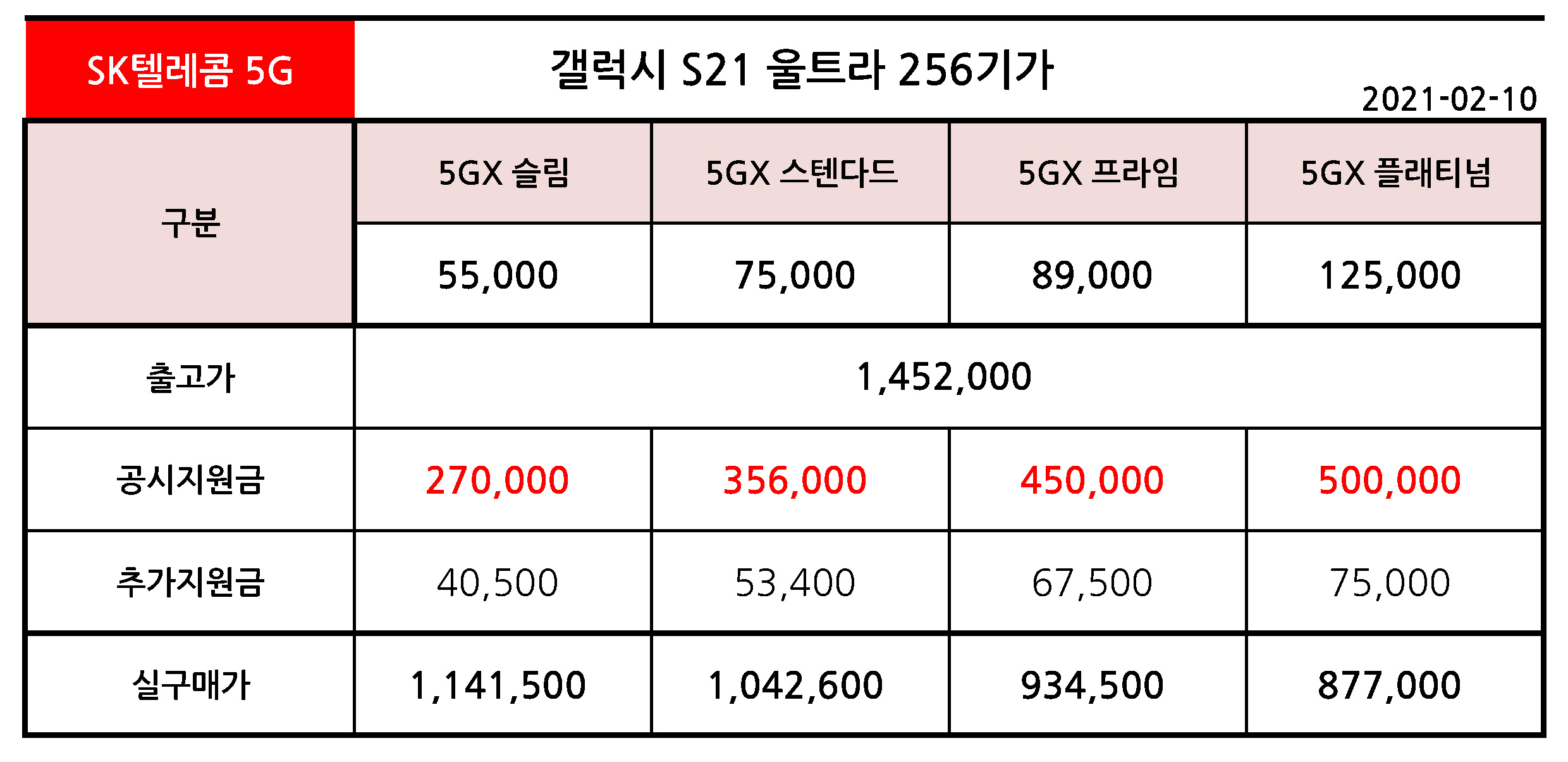 갤럭시 S21 울트라 256기가 공시지원금 - 2월 10일 기준