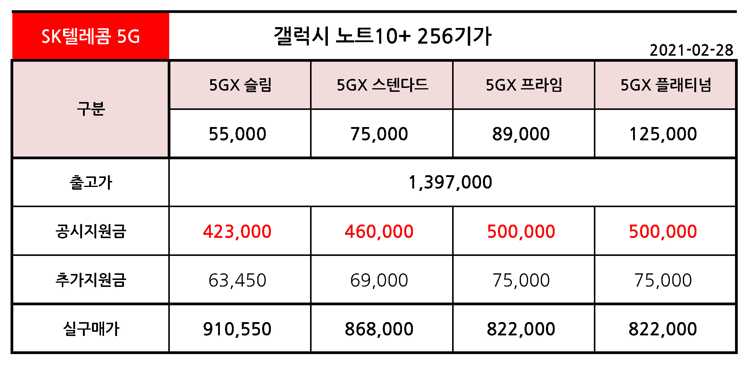 2월 28일 KT 에서만 갤럭시 노트10+ 256기가, 512기가 공시지원금이 상향되었으며,