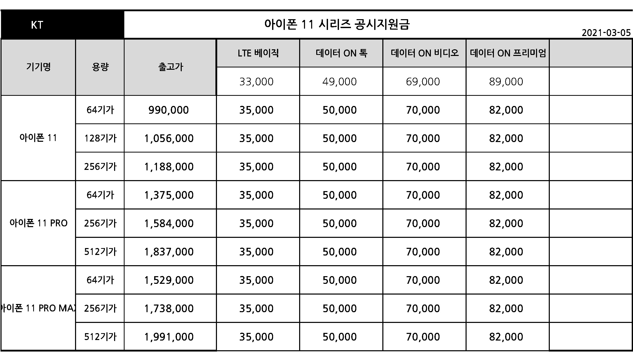 - KT 아이폰 11 시리즈 출고가 & 공시지원금 - 3월 5일 기준
