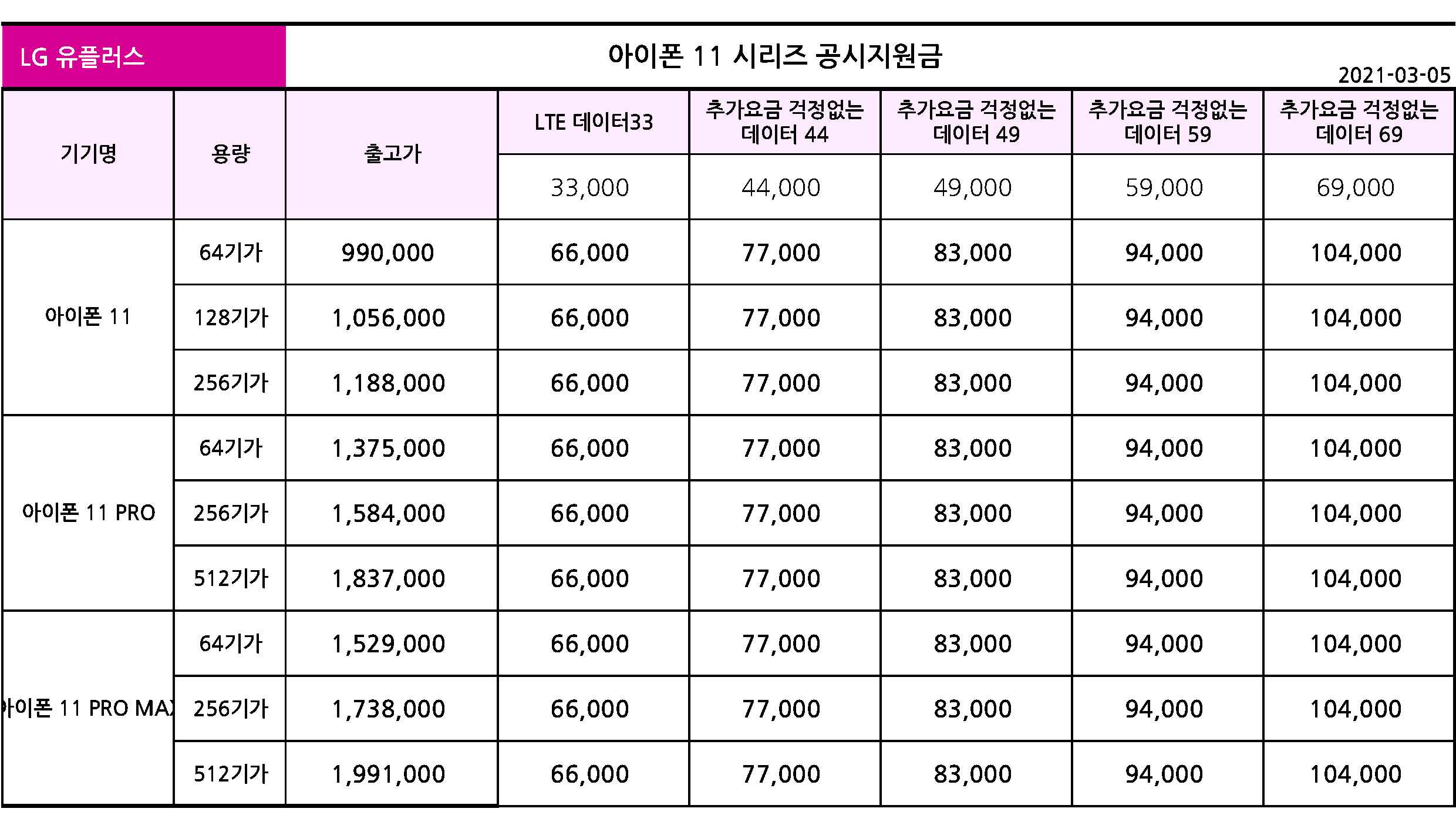 - LG 유플러스 아이폰 11 시리즈 출고가 & 공시지원금