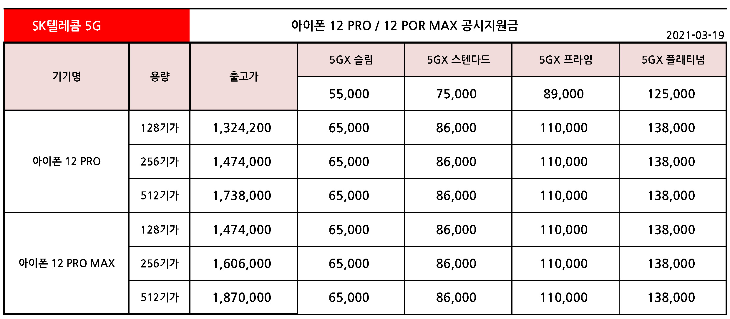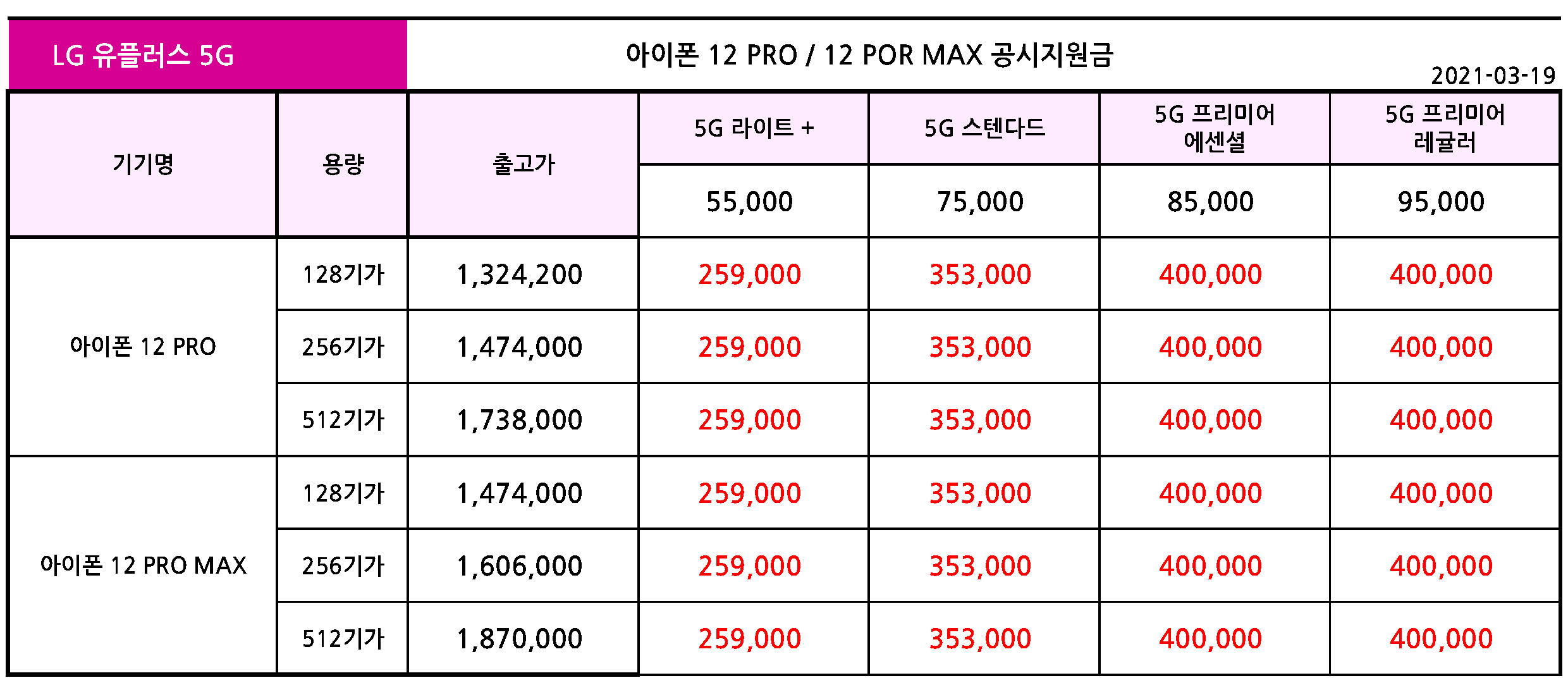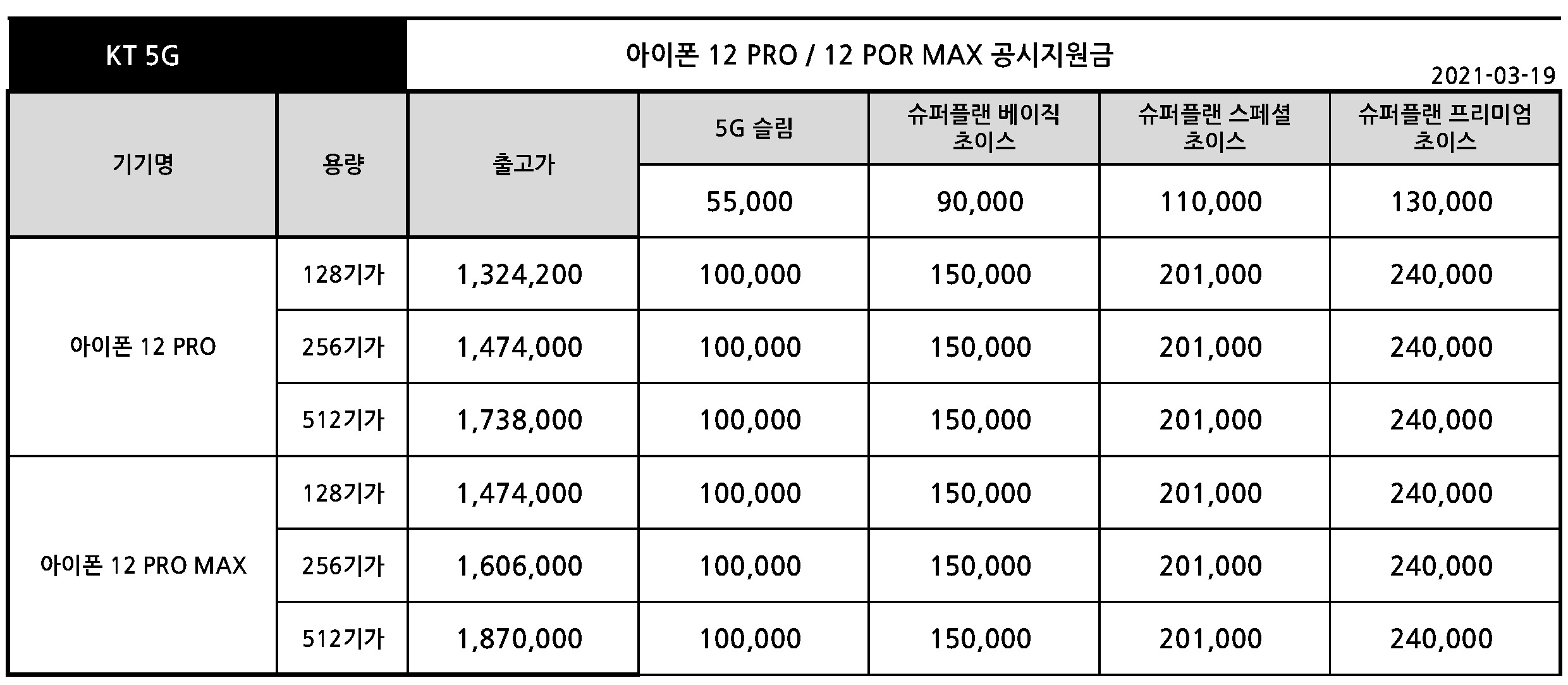 - 아이폰 12 PRO / 아이폰 12 PRO MAX 공시지원금 - 3월 19일 기준