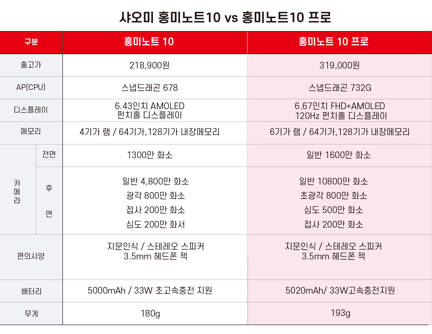 * 샤오미 홍미노트 10 VS 홍미노트 10 프로 스펙비교