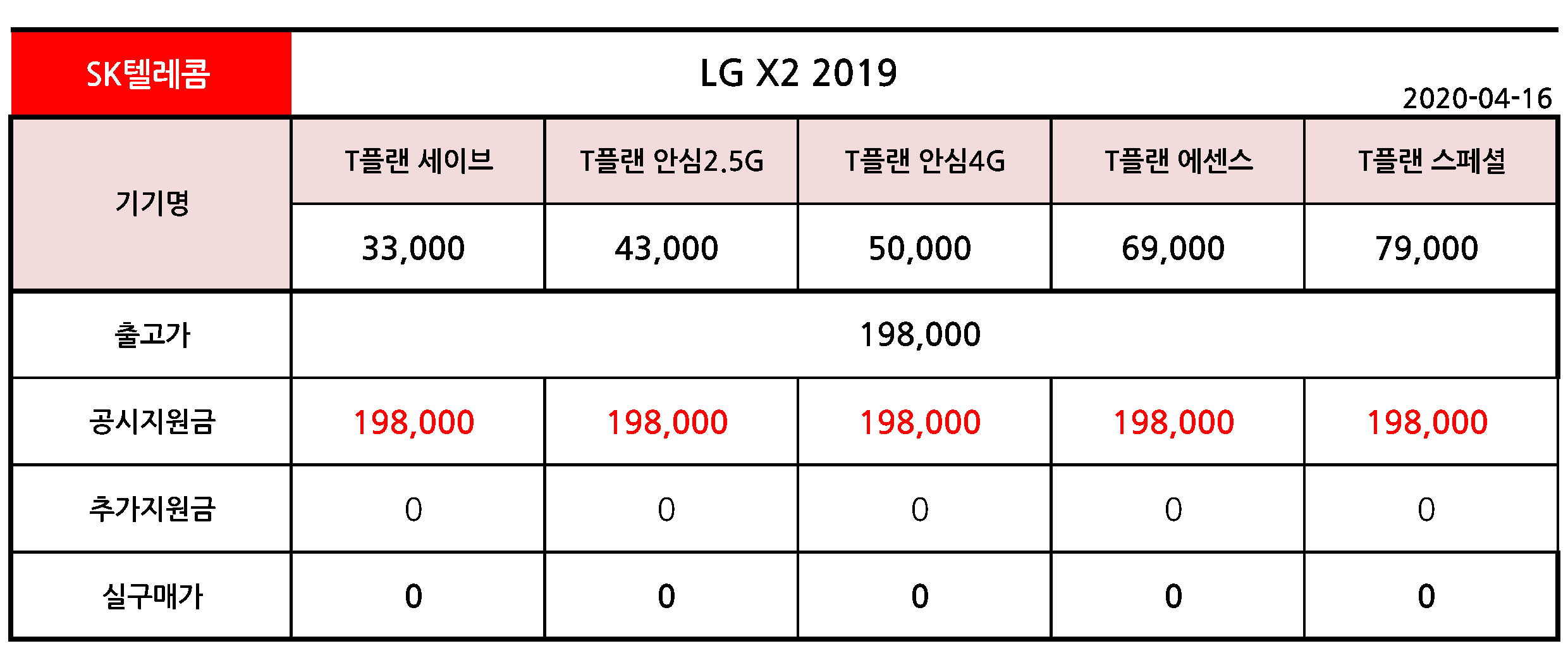 4월 16일 SK텔레콤에서 LG 전자의 저가형 LG X2 2019 의 공시지원금을 출고가 만큼 상향조정하여
