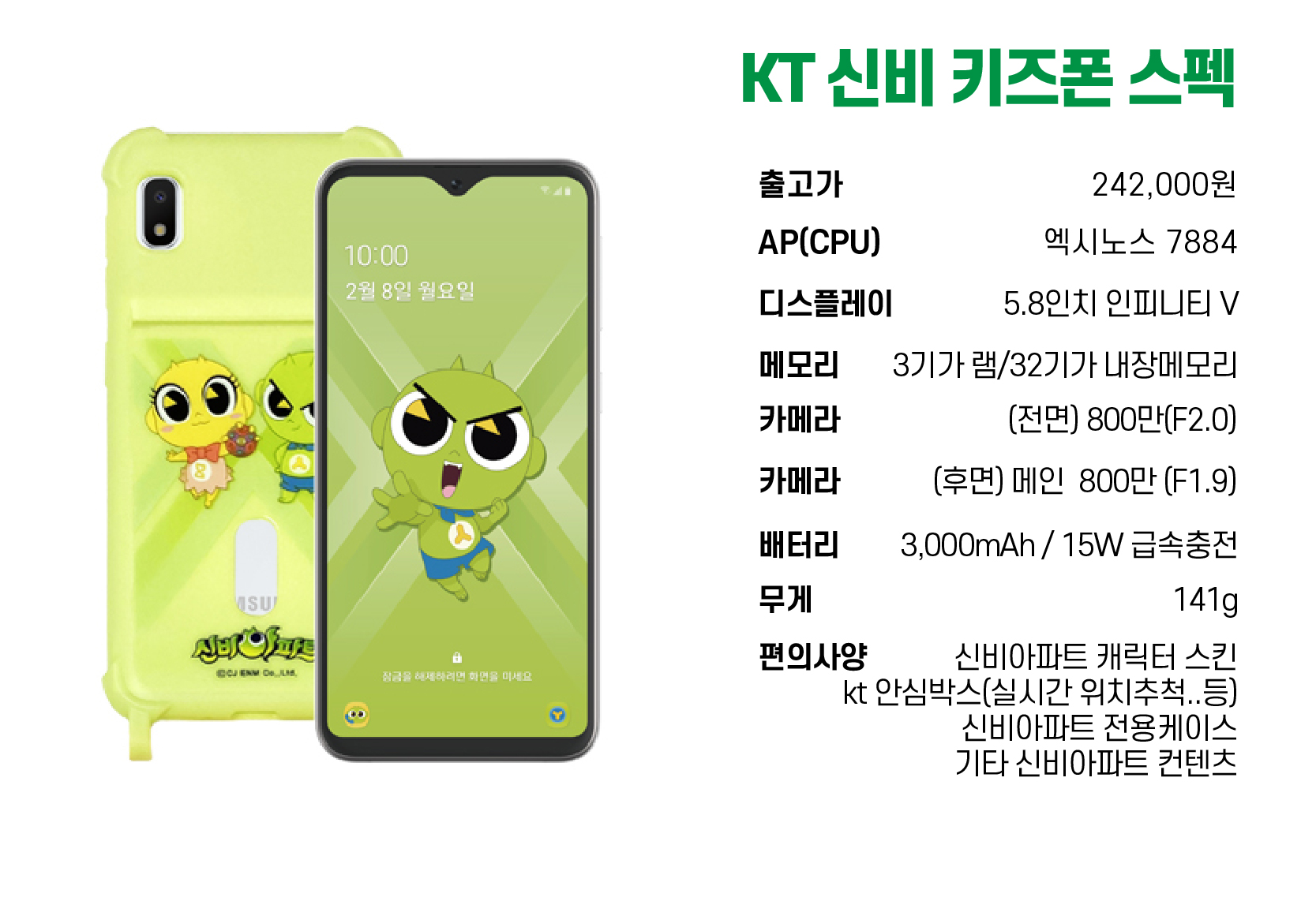 갤럭시 A10e 휴대폰을 기반으로 신비 캐릭터 스킨과 신비아파트 컨텐츠, 키즈(보호)관리를 위한 컨텐츠를
