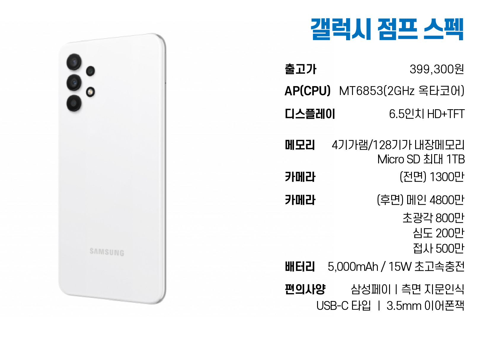 갤럭시 점프는 올해 3월 출시된 갤럭시 A32 의 5G 버전이며, KT 전용폰으로 출시됩니다.