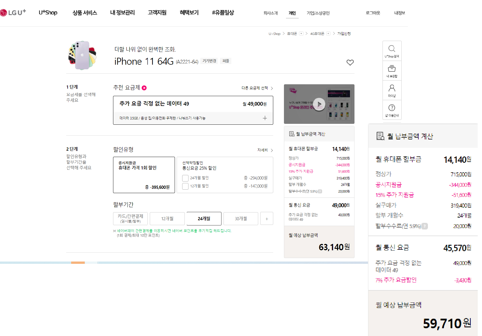 LG 유플러스 직영샵 실구매가 - 아이폰 11 64기가