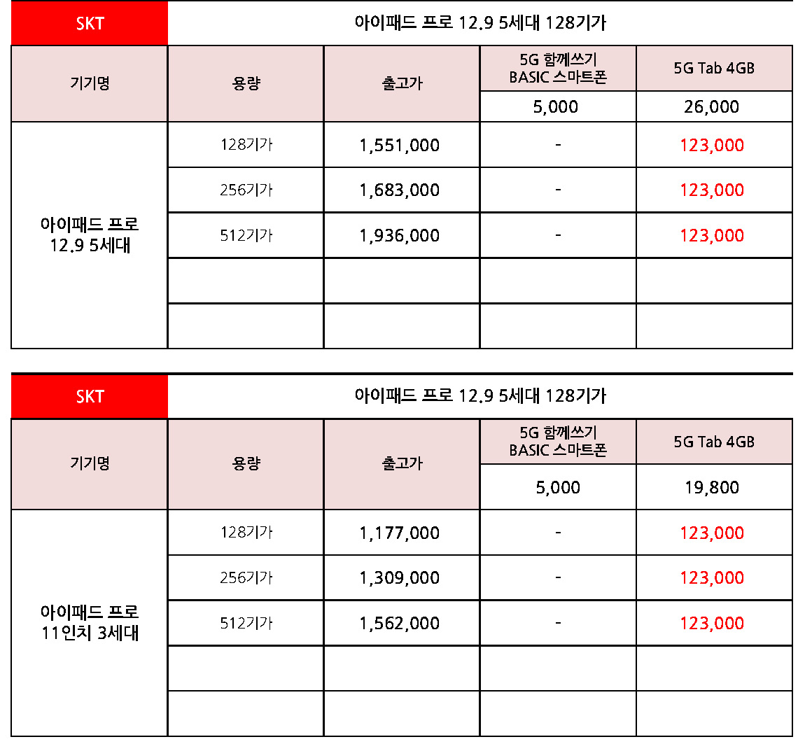SK텔레콤 아이패드 프로 12.9 5세대, 11 3세대 출고가 & 공시지원금