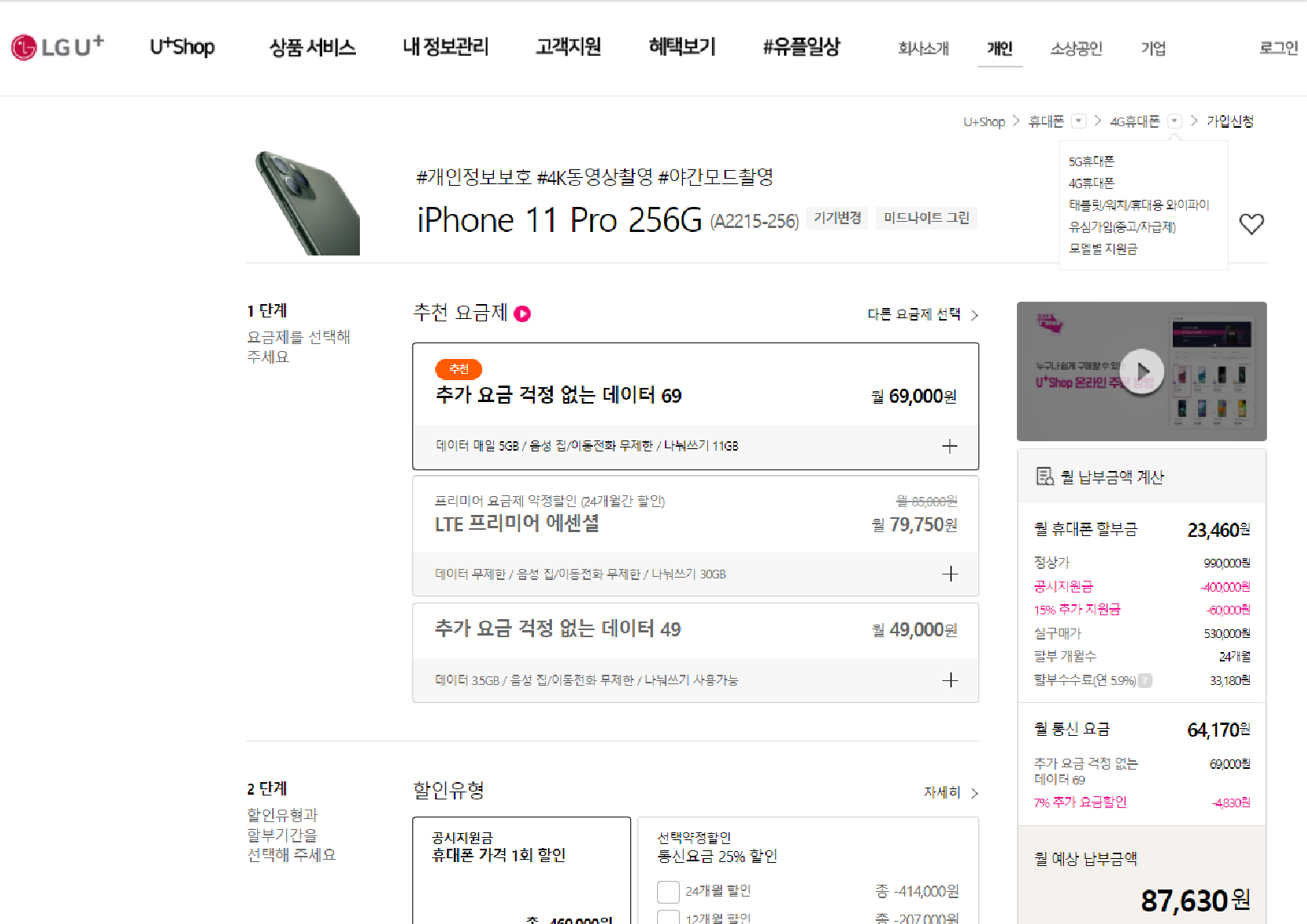 아이폰 11 프로 256기가 LG 유플러스 공홈에서는 69요금제 공시개통 기준 87,630원대 구매가 가능합니다.