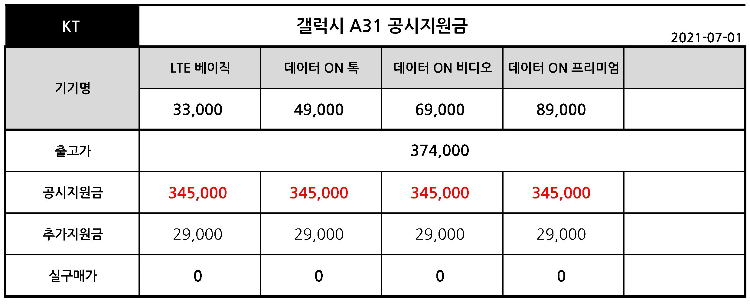 KT 갤럭시 A31 의 공시지원금이 상향되어 공짜폰이 되었습니다.