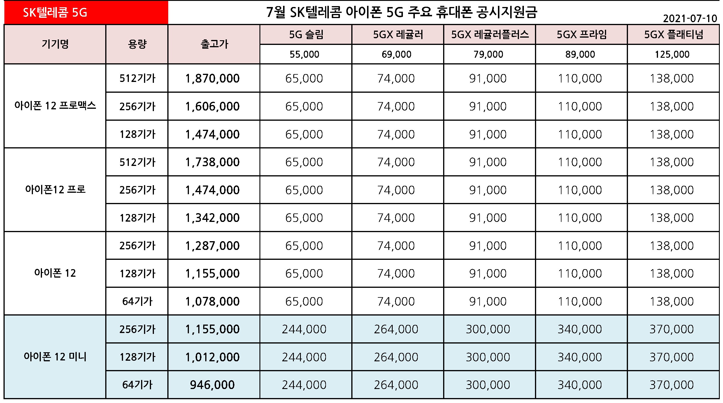 7월 SK텔레콤 5G 아이폰 공시지원금 정리 - 7월 10일 기준