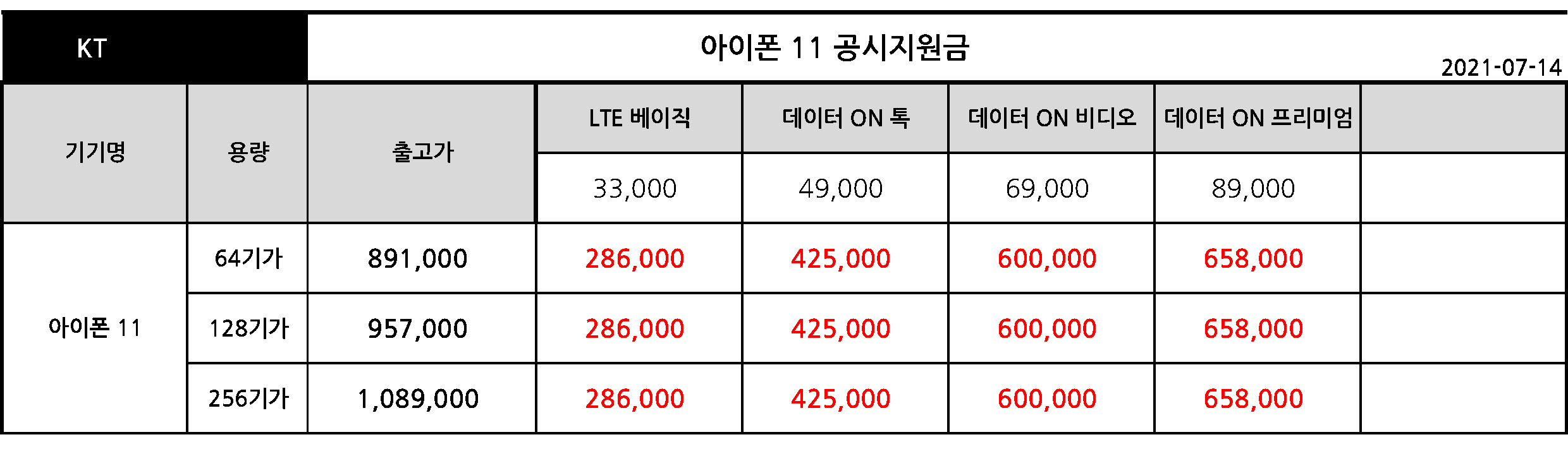 7월 14일 KT 아이폰 11 시리즈의 공시지원금이 상향되었습니다.