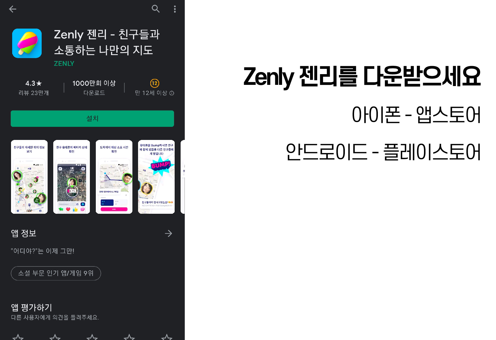 1) 아이폰 - 앱스토어, 안드로이드 - 플레이 스토어에서 젠리(Zenly)를 검색하여 설치하세요!