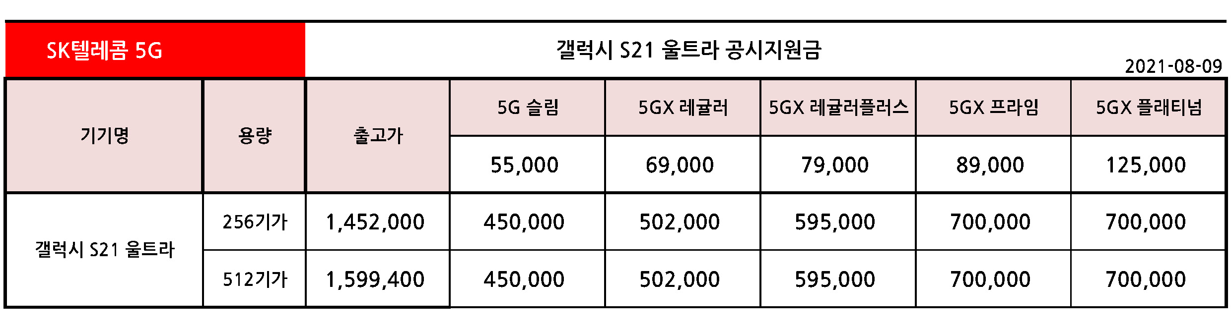 8월 9일 - SK텔레콤 갤럭시 S21 울트라 89요금제 공시지원금 150,000원 -> 700,000원 ( +550,000원)