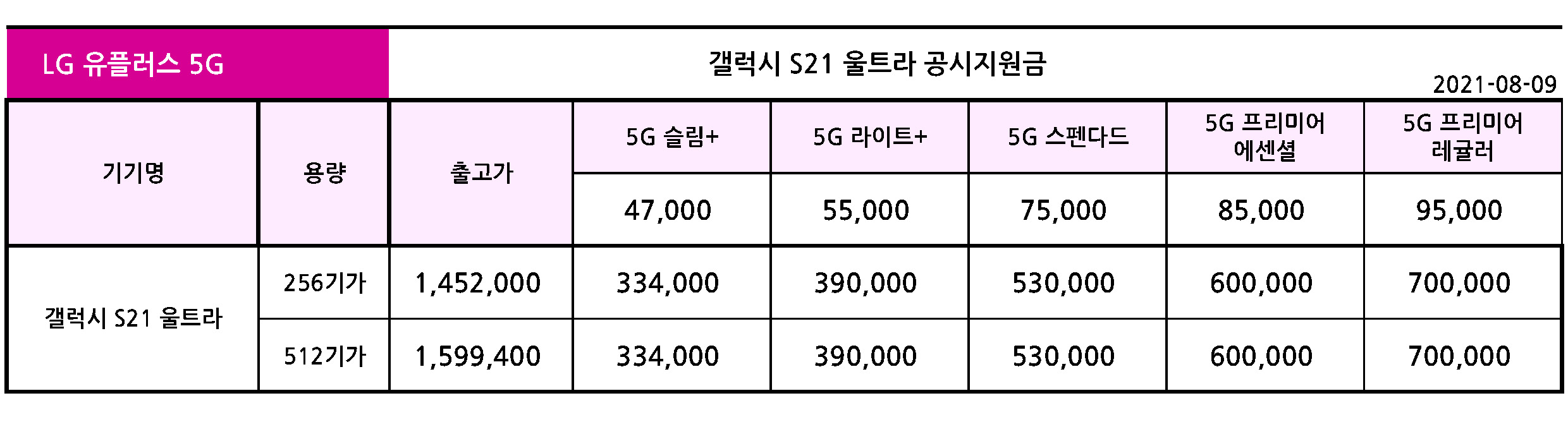 8월 8일 - LG 유플러스 갤럭시 S21 울트라 85요금제 공시지원금 151,000원 -> 600,000원 (+449,000원)