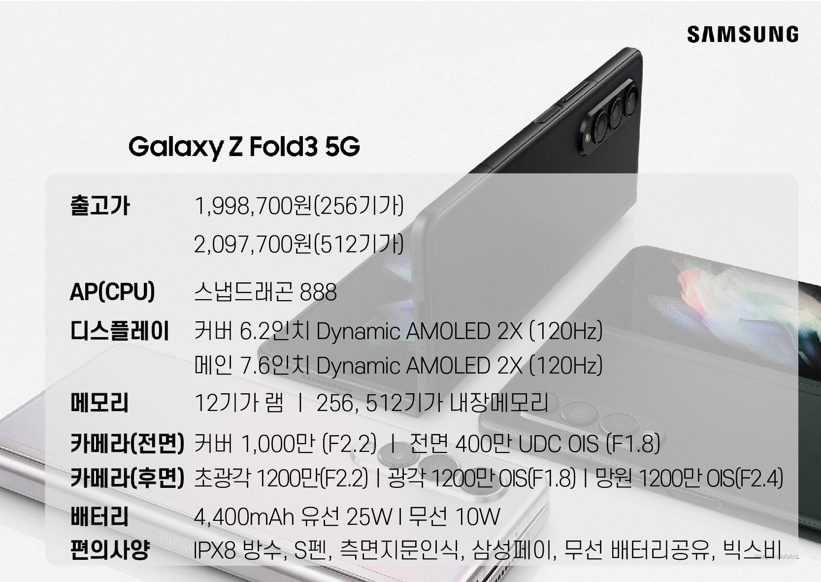 갤럭시 Z 폴드 3 256기가 출고가 1,998,700원, 512기가 2,097,700원 2종으로 출시 되었습니다.
