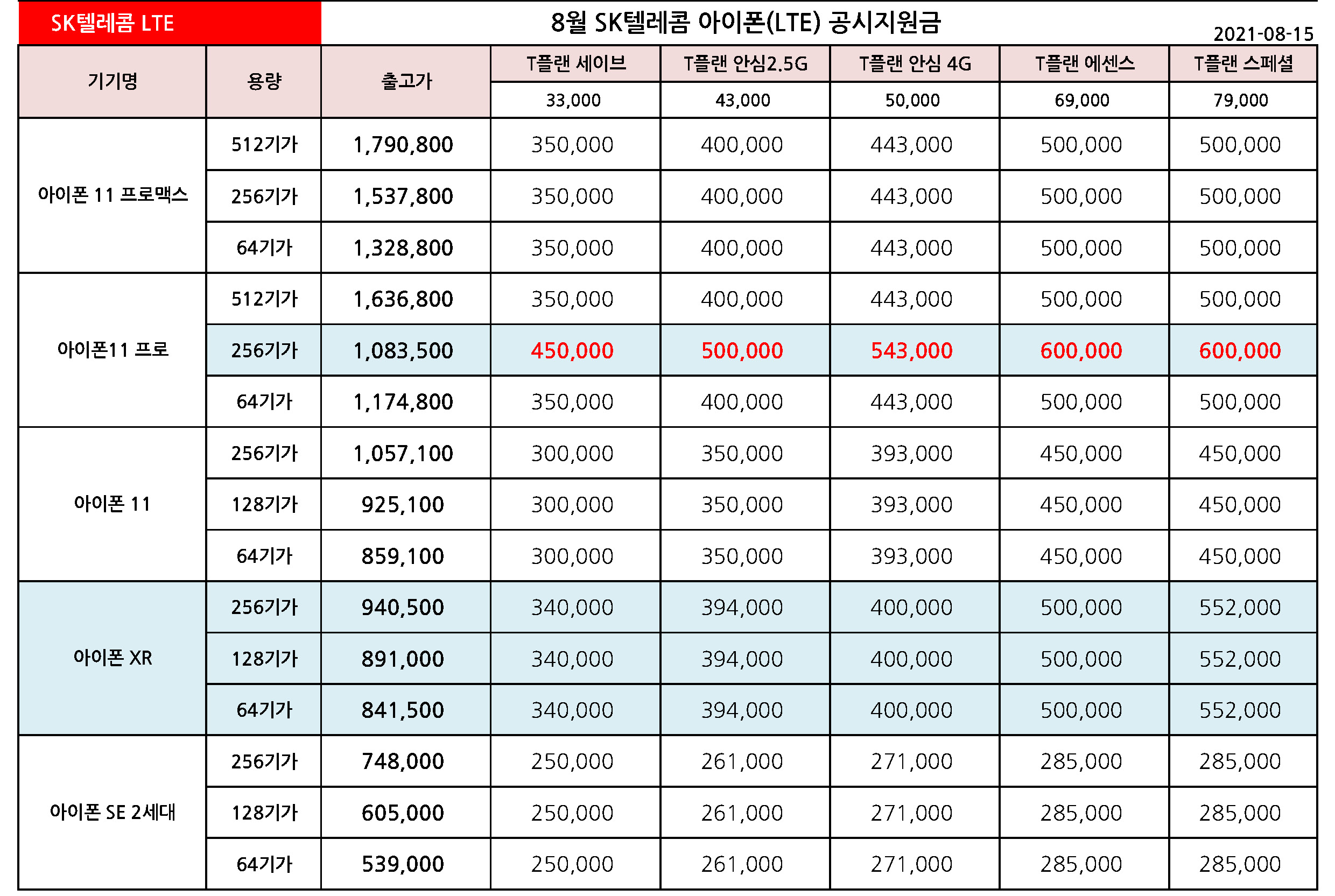 - 8월 11일 아이폰 11 프로 256기가(출고가 1,083,500원) 공시지원금 상향