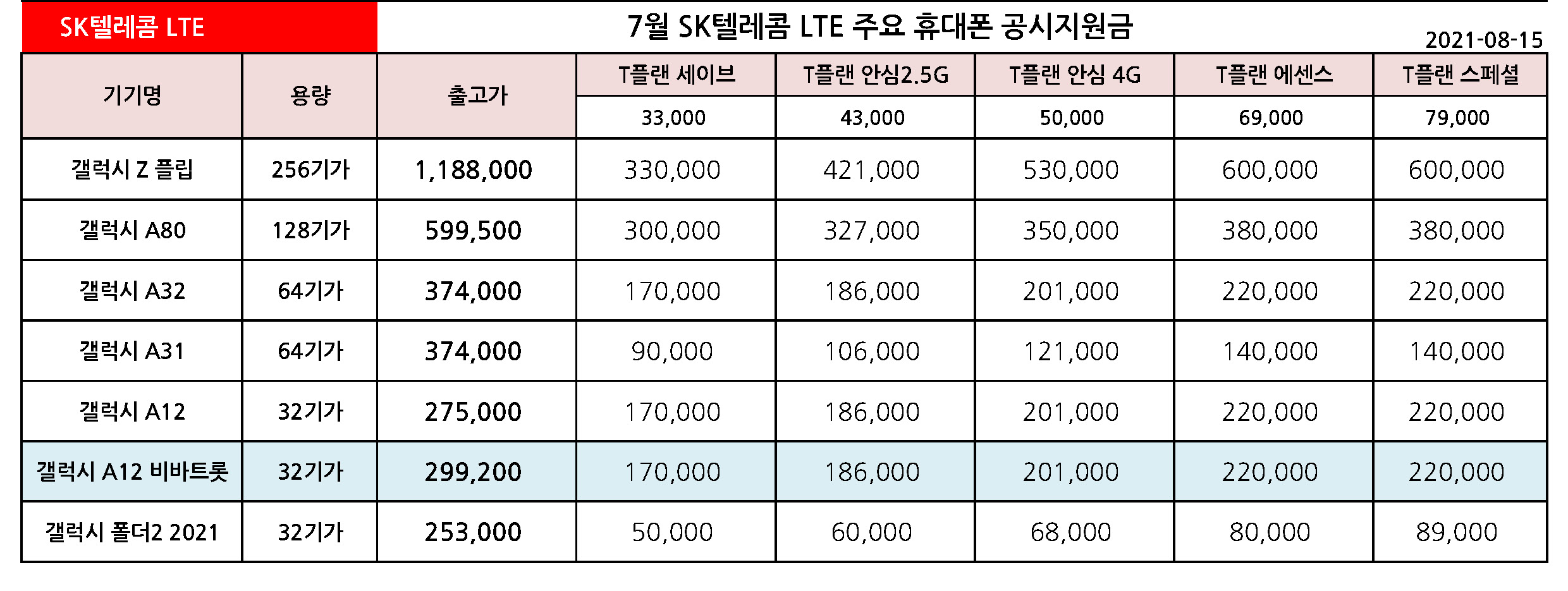 8월 SK텔레콤 주요 휴대폰 공시지원금 정리 - 8월 15일 기준