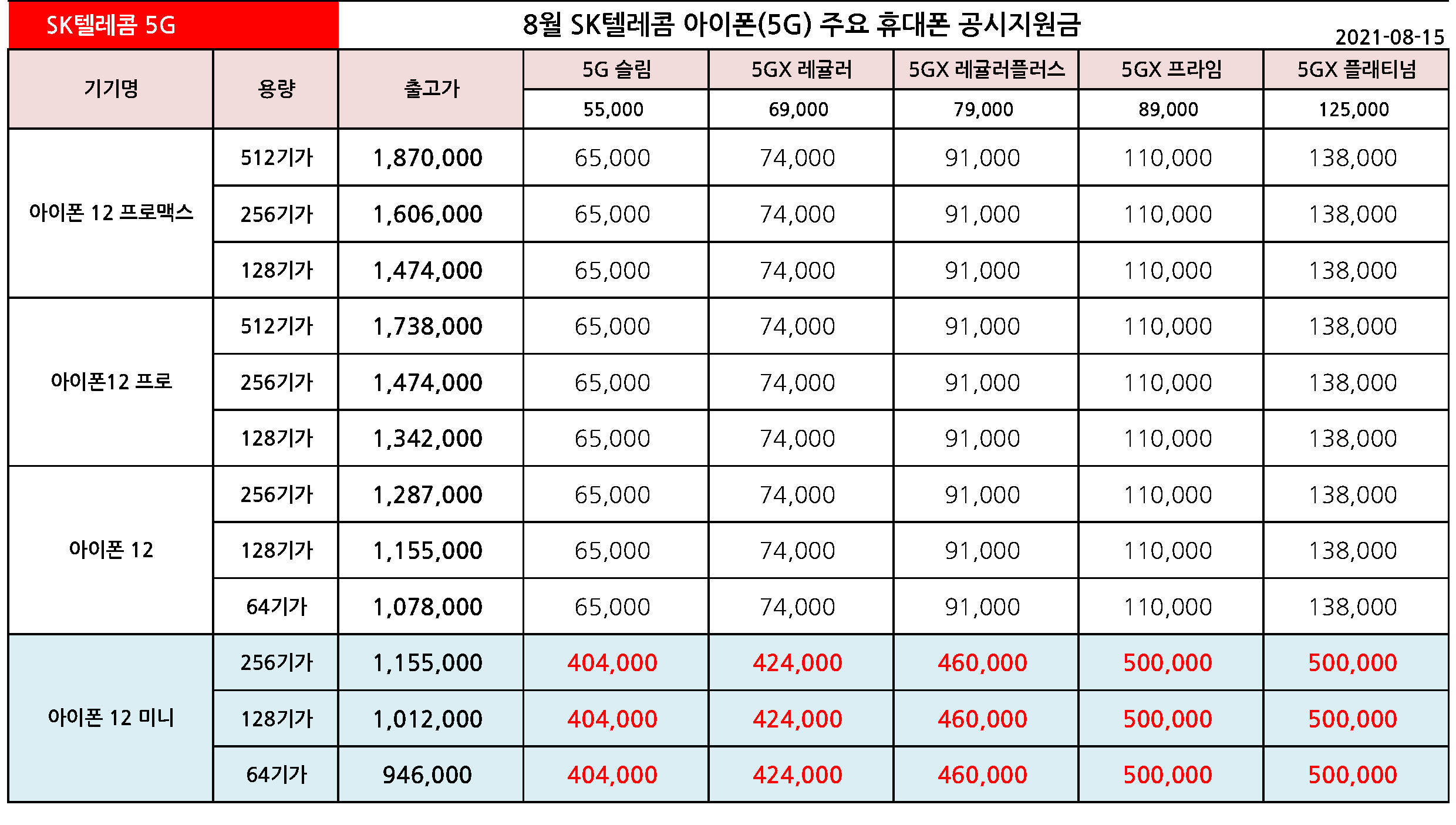 - 8월 9일 아이폰 12 미니 시리즈 공시지원금 상향