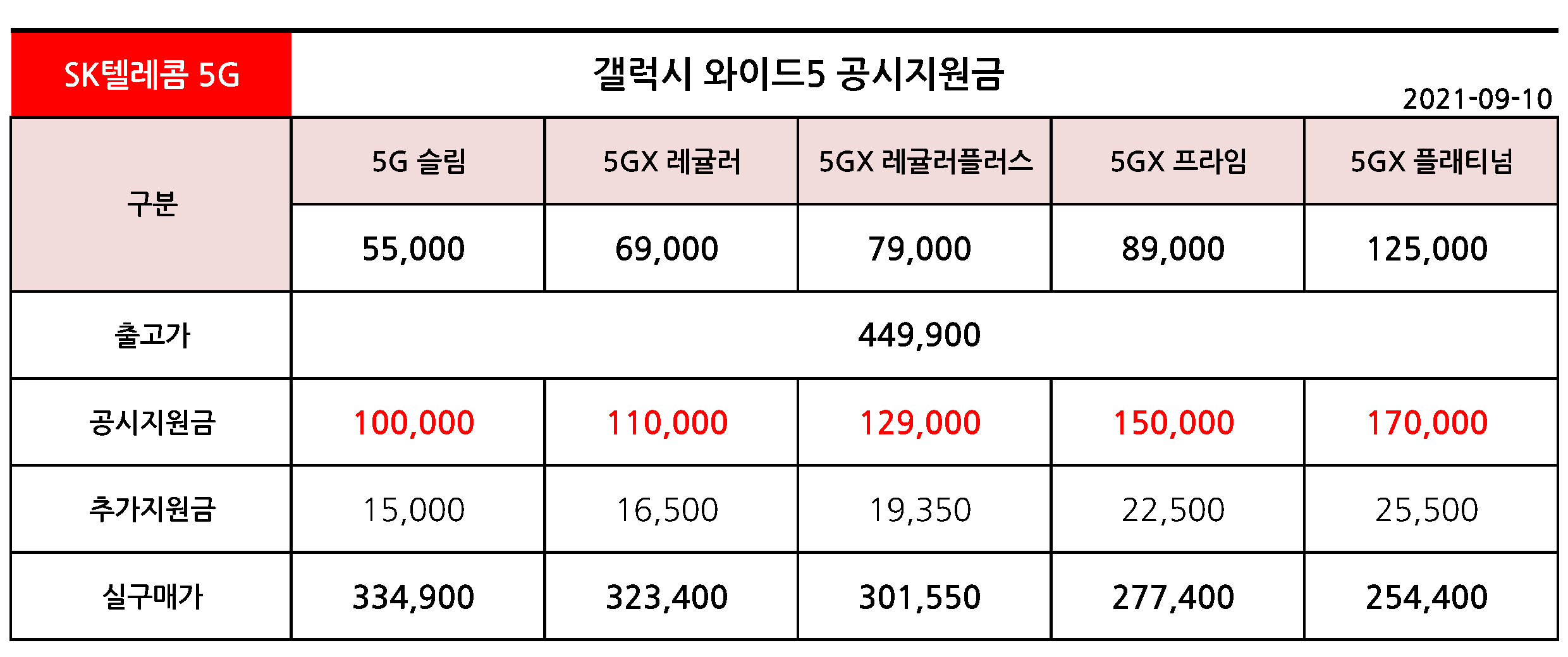 갤럭시 와이드5 5G 공시지원금 & 실구매가 - 9월 10일 기준 (SK텔레콤 전용폰)