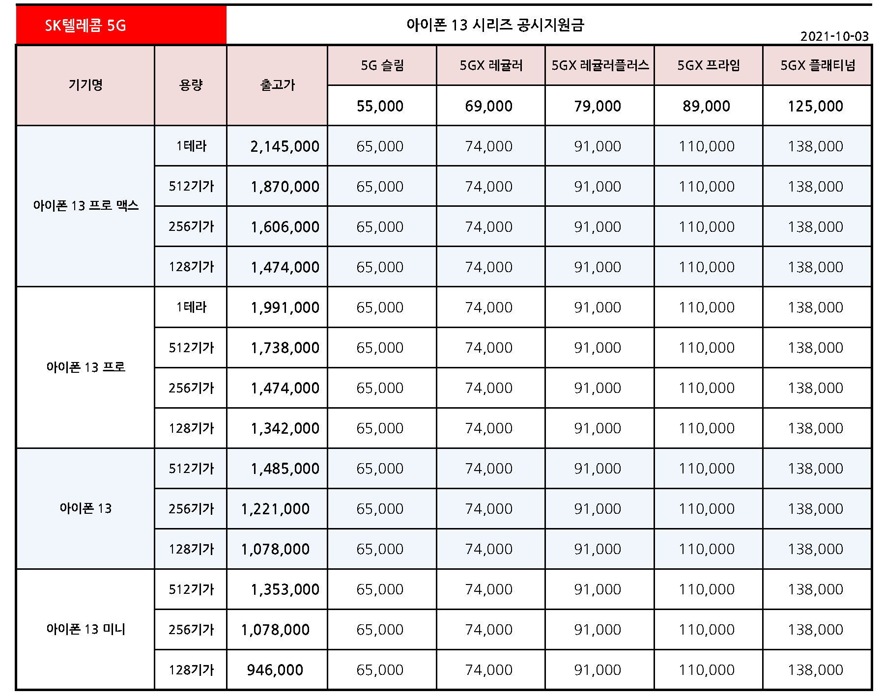 - 현재까지 공개된 아이폰 13의 공시지원금 이며, 출시일 인 10월 8일 변동이 있을수 있습니다.