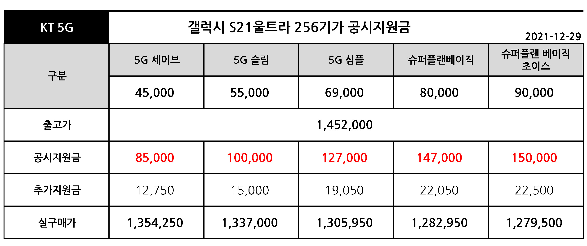 갤럭시 S21 울트라 공시지원금 & 실구매가 - 12월 29일이후 지원금 변경일 까지