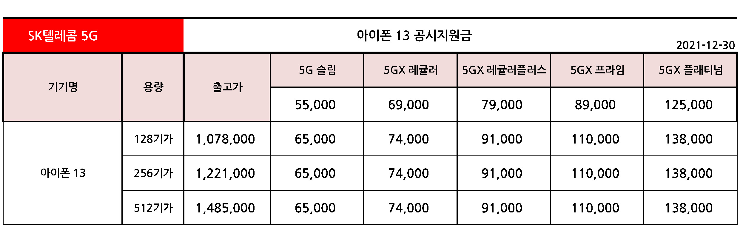 아이폰 13 공시지원금 정리 - 12월 30일기준
