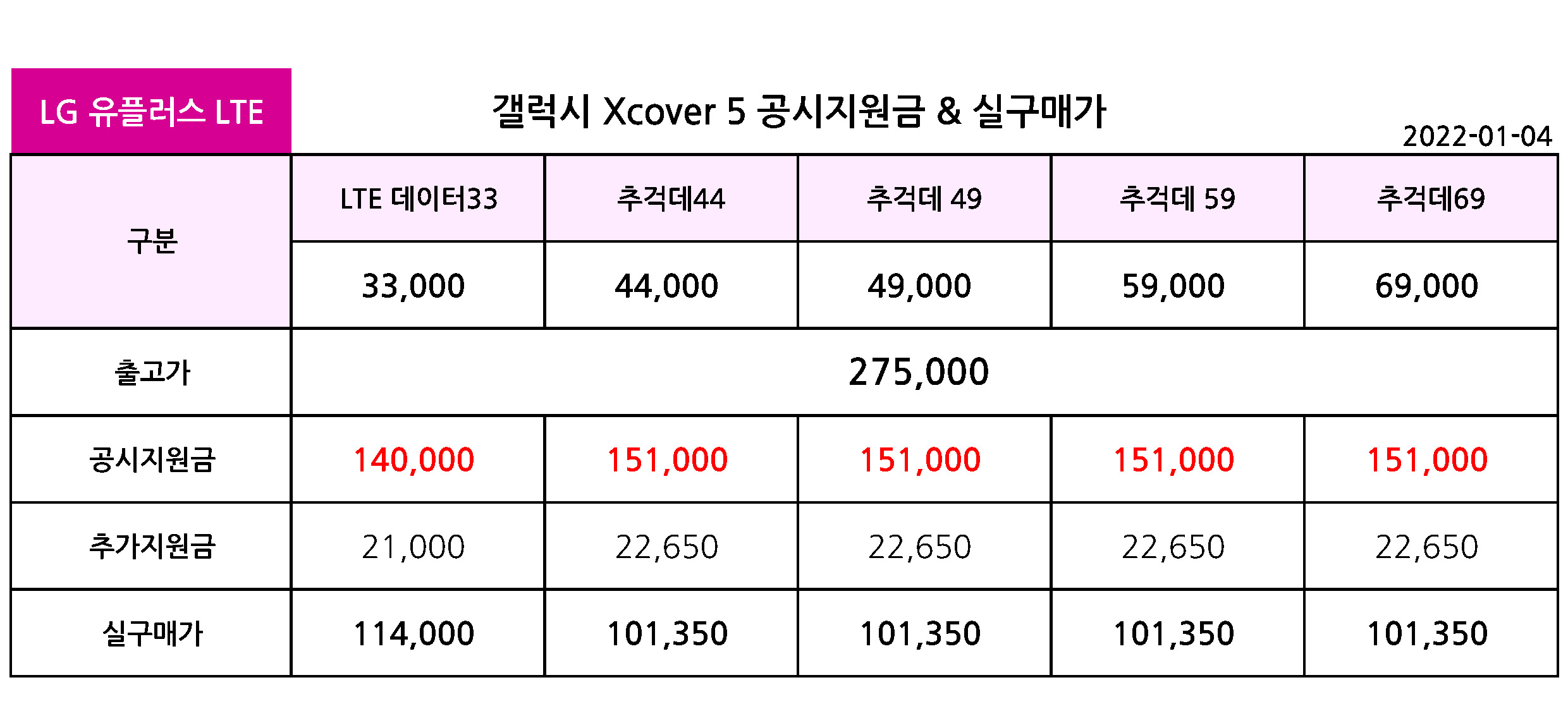 갤럭시 XCover 5 공시지원금 정리 - 2022년 1월 14일기준 ( 아래 공시지원금 이미지 날짜오타!)