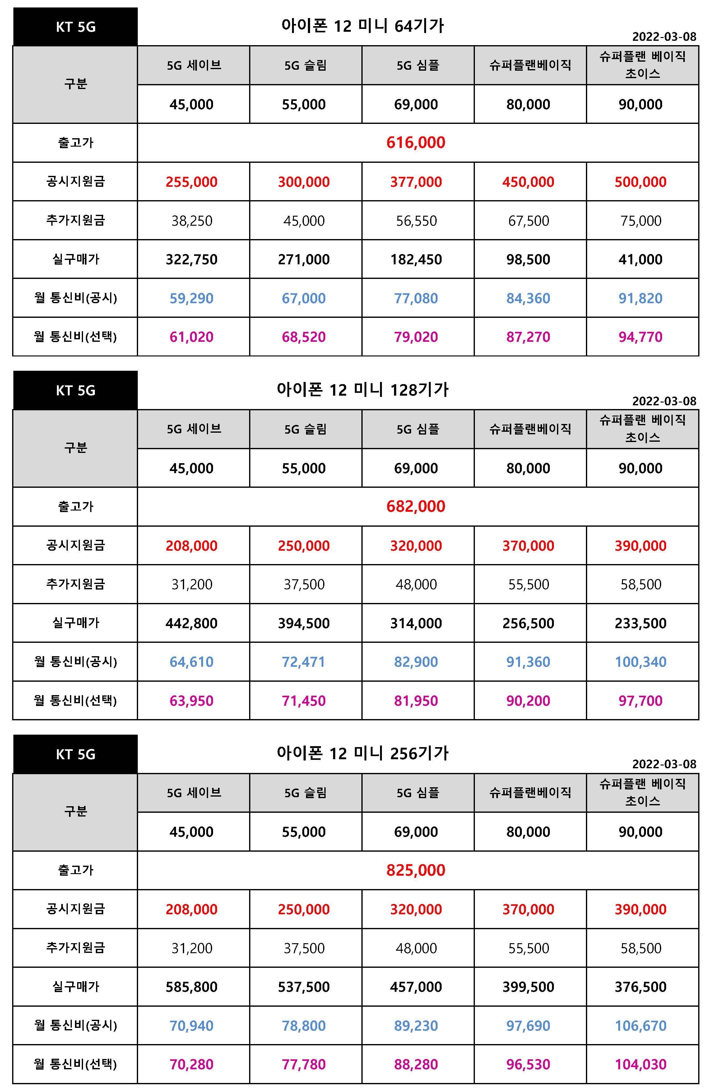 아이폰 12 미니 64기가, 128기가의 공시지원금만 상향 조정되었으며