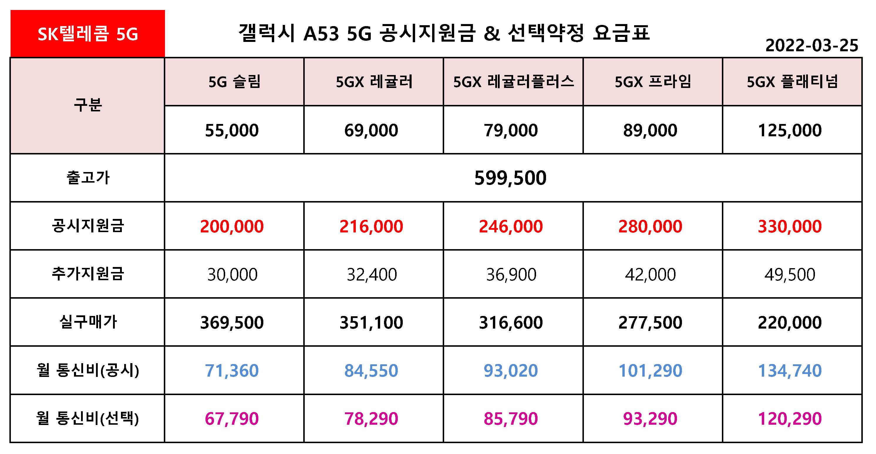 갤럭시 A53 5G 공시지원금 VS 선택약정 월 통신비 정리 - 3월 25일 기준 공시지원금 변경일 까지