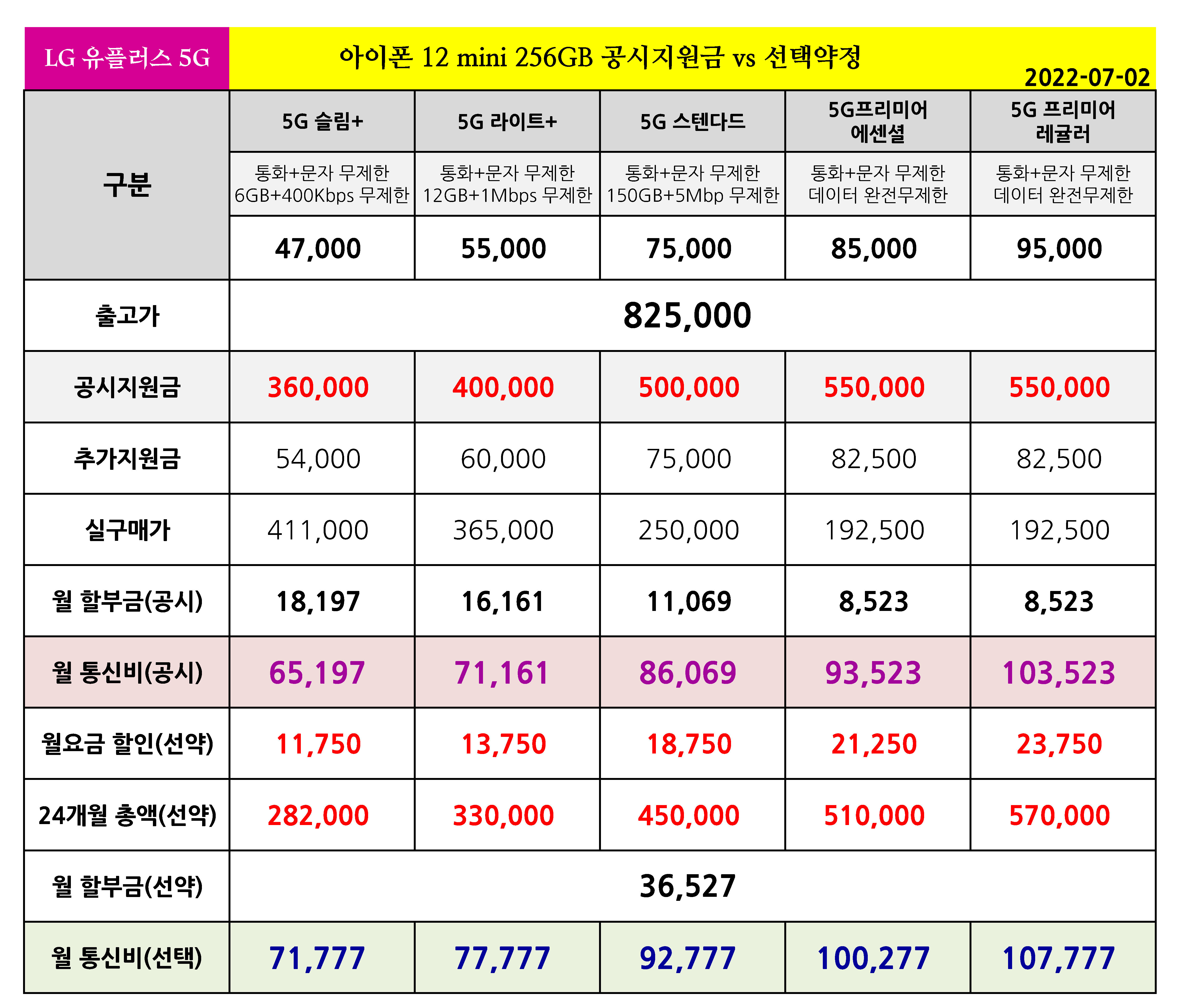아이폰 미니 12 256기가 공시지원금 VS 선택약정 월 통신비 비교 - 7월 2일 기준