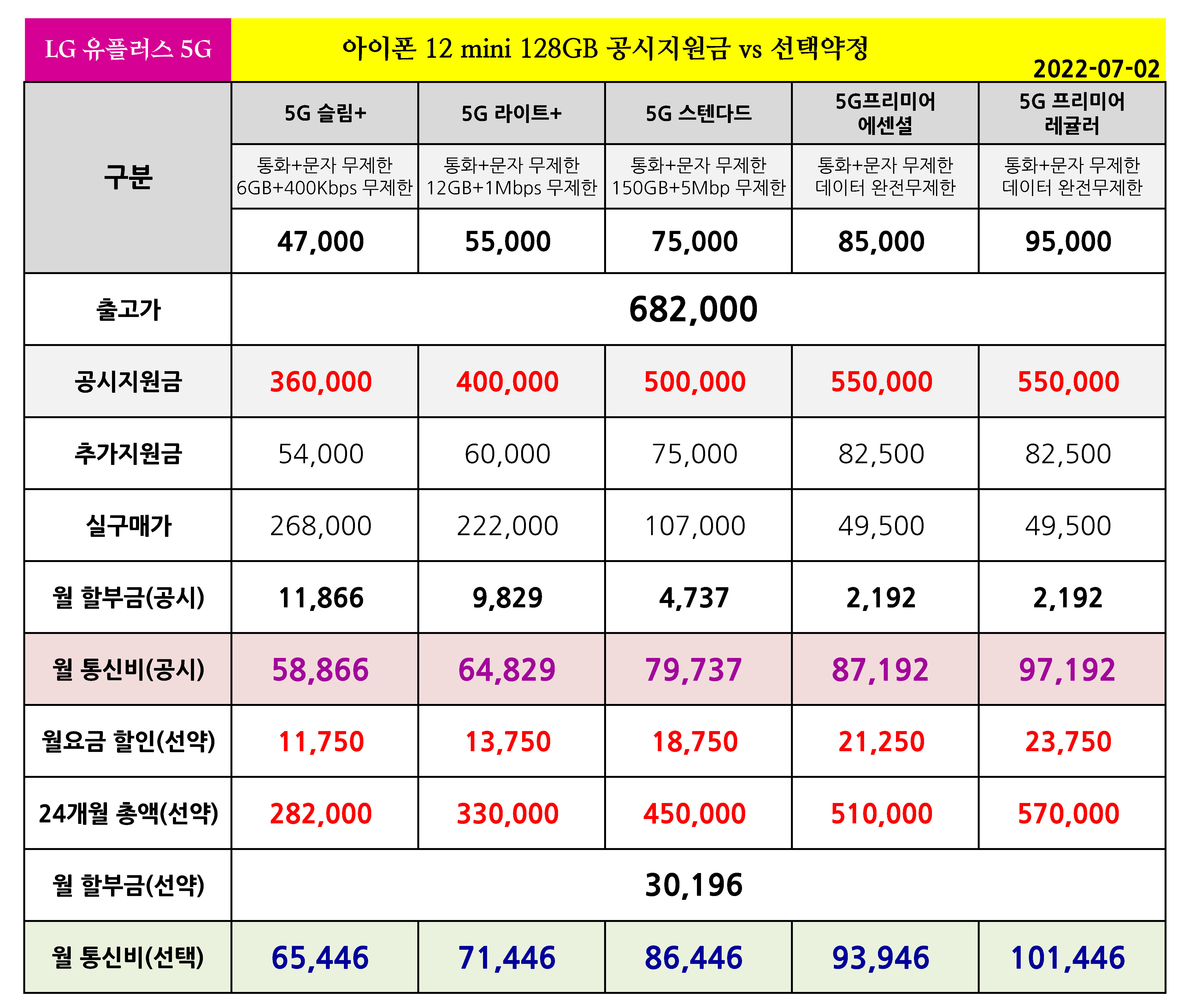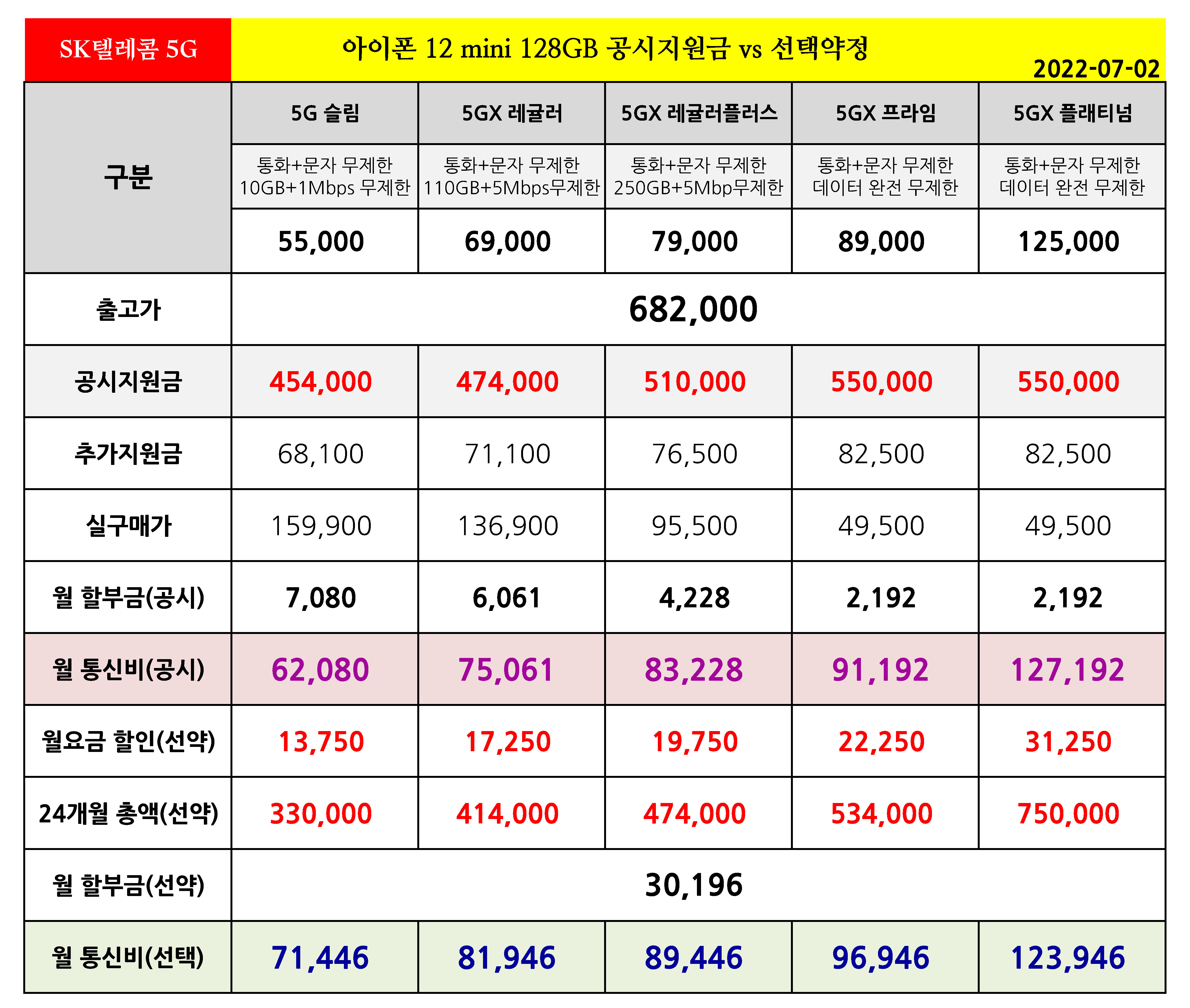 아이폰 12 미니 128기가 공시지원금 VS 선택약정 월 통신비 비교 - 7월 2일 기준
