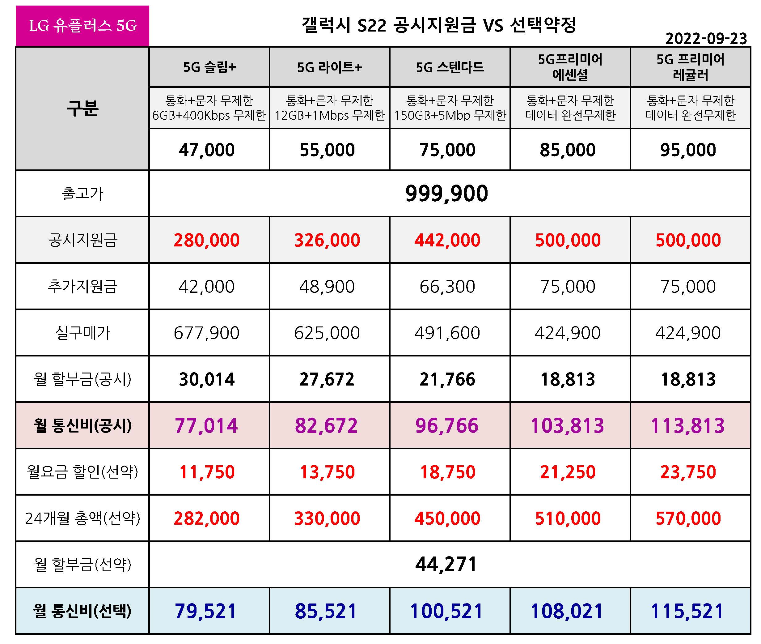 갤럭시 S22 공시지원금 VS 선택약정 월 통신비 비교 - 9월 23일 기준