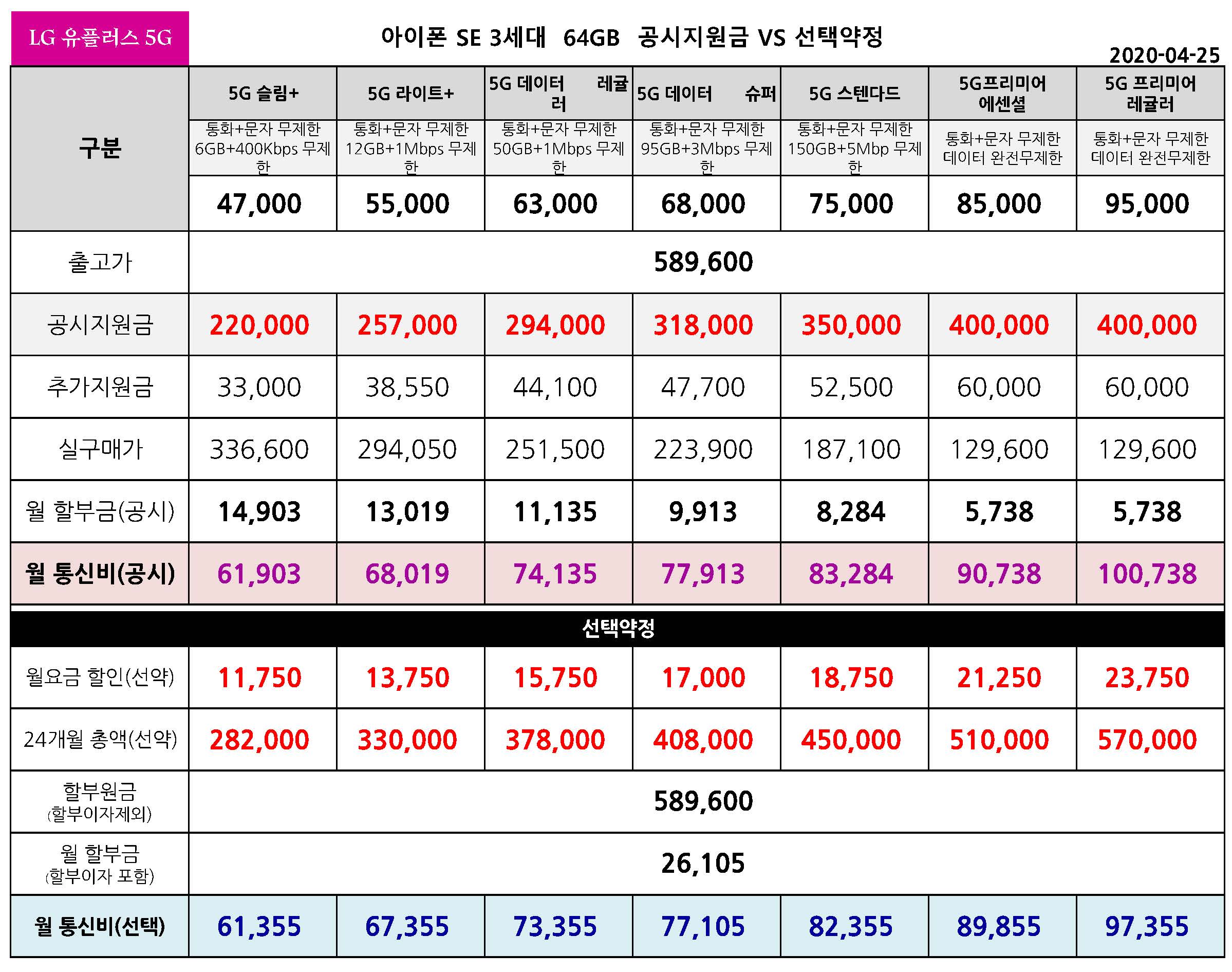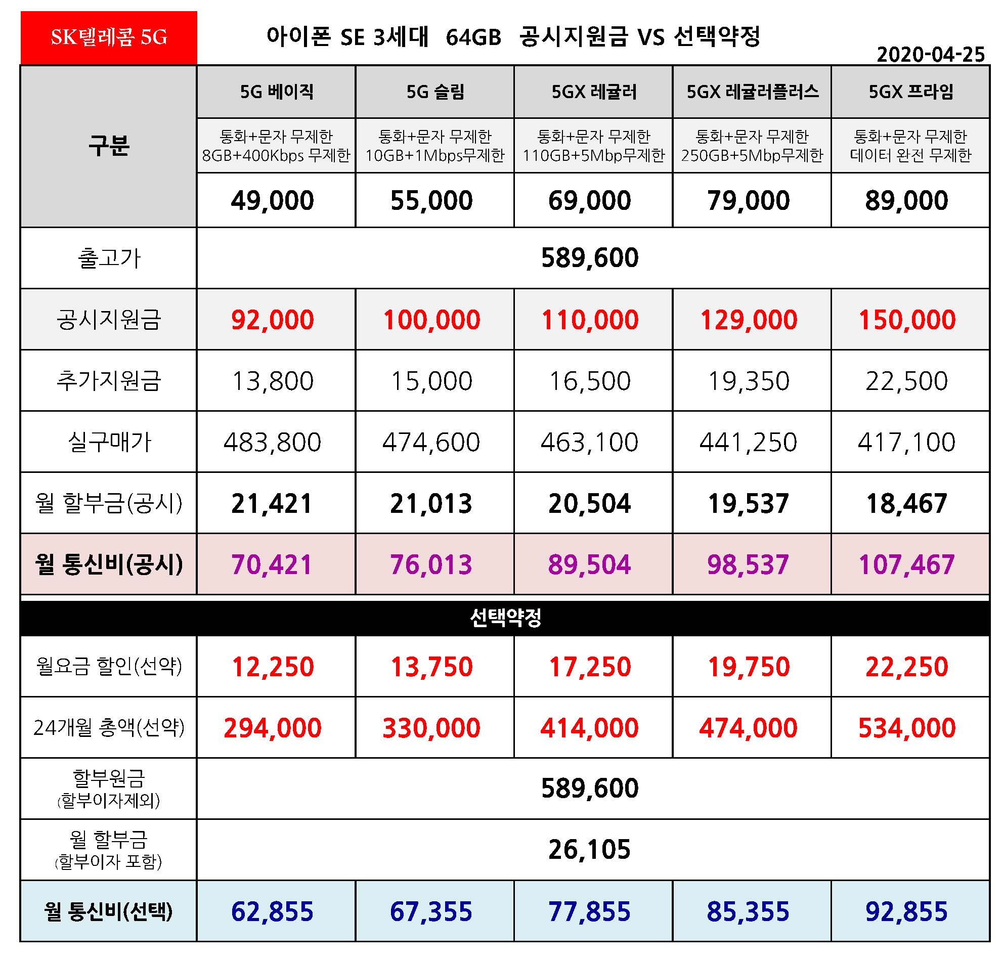 아이폰 SE 3세대 128기가 공시지원금 & 선택약정 월 통신비 요금표