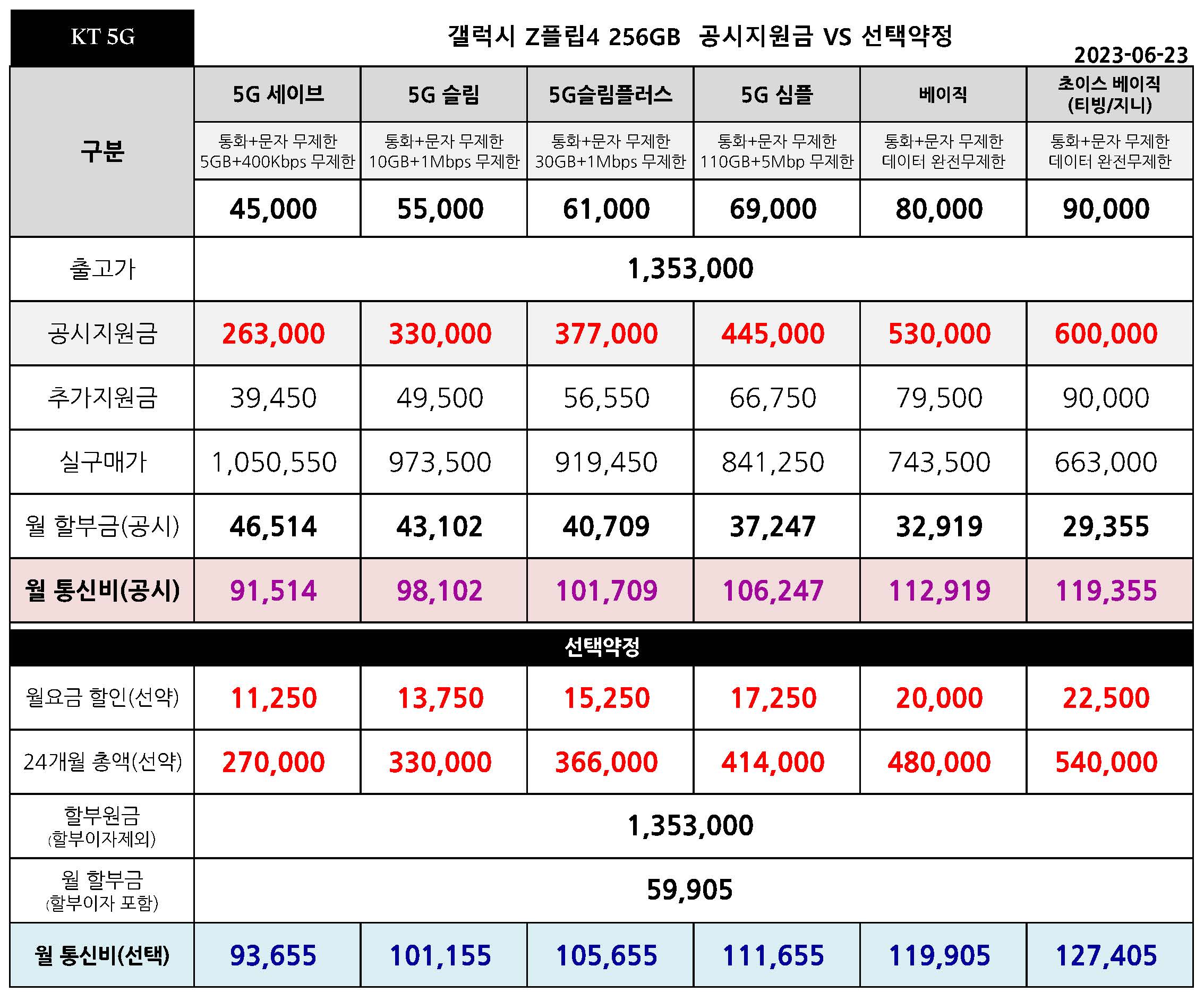 KT 갤럭시 Z 플립4 256기가와 512기가 요금제별 월 통신비 약 5,000원 ~ 6,000원 차이 납니다.